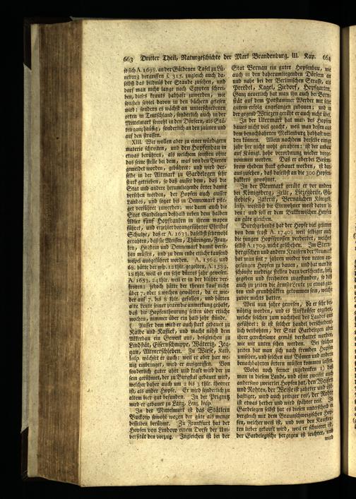 ſelbſt das bildnuͤß der Staude zuſehen, und darf man nicht lange nach Egypten ſchreiben, dieſes krauts habhaft zuwerden, wie ſonſten ſobiel dabon in den büchern geleſen wirb: ſondern es waͤchſt an unterſchie denen prten in Teutſchland, ſonderlich auch in der Mittelmark ſowohl in den Dörfern, als Staͤ fen ganz haufig, ſonderlich an den zauͤnen und auf den ſtraſſen. p Llll. Wir wollen aher zu einer wuͤrdigern materie ſchreiten, und den Hopfenbau in etwas berühren, als welchem ſonſten ohne das ſeine ſtelle bei dem, was bon den Bieren gemeldet worden, gebuͤhret: und wird derſelbe in der Altmark zu Gardelegen ſehr ſtark getrieben, ſo daß auſſer dem, daß die Stat und andere herumliegende oͤrter damit verſehen werden, der Hopfen auch auſſer Landes, und ſogar bis in Dennemark pfleget verfuͤhret zuwerden; wie dann auch die Stat Gardelegen deßhalb neben dem halben Adler funf Hopfranken in ihrem wapen fuͤhret, und erzehlet borangefuͤhrter Chriſtof Schultz, daß er A. 1633 daſelbſt ſehrwohl gerahten, daß fie Meiſſen, Thuͤringen, Franken, Holſtein und Dennemark damit berſehen müfen, und zu dem ende etliche tauſend wiſpel ausgefüͤhret worden. R, 1564. und 68. haͤtte der wſp. 12 thlr. gegolten,. 1589. 18 thlr. weil es ein ſehr duͤrres jahr geweſen. A. I653. 24 thlr. weil er in der bluͤhte verfrören; jedoch hätte der theure kauf nicht