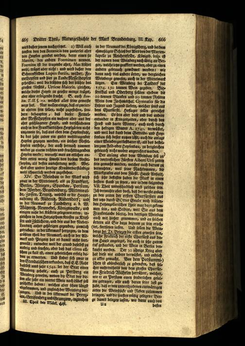 wohl ſchwerlich werden zugeſtehen. 7 XIV. Der Weinbau in der Mark wird zwar in der Mittelmark, als zu Frankfurt, Berlin, Wriezen/ Spandau, Potſtam, dem Werder, Brandenburg, Mittenwalde, Zoſſen, Teupitz, woſelbſt er die Hauptnahrung iſt, Ruͤdenitz, Ruͤdersdorf; und in der Neumark zu Landsberg a. 5. W. Waͤperitz. Neuwedel, Königswalde, und einigen nahe bei Kuͤſtrin gelegenen orten; ingleichen in dem Herzogthum Kroſſen zu Kroſfen und Zullichow, und den aus der Nieder: Lausnitz anher gehörigen gegenden, ziemlich getrieben: in der Ukermark hergegen, in dem größten theil der Neumark, auch in der Alt; mark und Prignitz hat es damit nicht fort; gewollt; entweder weil der grund daſelbſt zu niedrig und feuchte, oder daß das clima allſchon zu kalt iſt, einen gedeielichen erfolg dabon zu erwarten. Und findet ſich zwar in den Stendaliſchen urkunden, daß EE. Raht daſelbſt ums jahr 1542. bei der Stat einen Weinberg gehabt, auch zu. ein inderg geweſen, wo on die Stat vor die: ſem alle jahr ein biertel Wein nach Luͤbek ſoll geſchilket haben: welches aber ſchon laͤngſt abgekommen, und zugleich der Weinberg ver; (langen. Und in der likermark bei PrenzGreifenberg und Gramzow, ingleichen II. Theil der Mark, Hiſt..