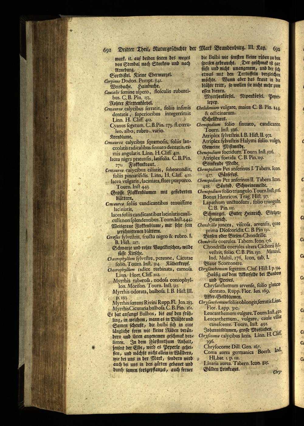 mark. it. auf beiden ſeiten des weges von Stendal nach Storkow und nach Arneburg.. Sortdiſtel. Kleine Eberwurzel. Carpinus Dodon. Pempt. 841. Weisbuche. Hainbuche. GN Caucalis ſemine aſpero, floſculis rubentibus. C,B. Pin. 153...} Rohter Klettenkörbek 1. Centaurea calycibus ſerratis, foliis infimis dentatis, ſuperioribus integerrimis Linn. H. Cliff. 412.. Cyanus ſegetum. C. B. Pin. 273. fl cœruleo, albo, rubro. vario. Kornblume. A Centdures calycibus ſquamoſis, foliis lanceolatis radicalibus ſinuato dentatis, ramis angulatis. Linn. H Cliff 42 lacea nigra pratenſis, latifolia. C. B. Pin. 27½ Flokkenkraut.. Centaurea calycibus ciliatis, ſubrotundis, foliis pinnatifidis. Linn. H. Cliff. 42. lacea vulgaris laciniata, flore purpureo. Lourn. Inſt 443. Groſſe Flokkenblumen mit gefiederten blättern. ö Centaures foliis candicantihus tenuiſfime laciniatis, lacea foliis candicantibus lacinĩatis cauliculis non ſplendentibus. Lourn Inſt. 444. Weisgraue Flokkenblume, mit ſehr fein zerſchnittenen blättern.) Cerafus ſylveſtris, fructu nigro& rubro. I. B. Hiſt. 227. Schwarze und rohte Vogelkirſchen, wilde füge Kirſche. Chaerophyllum ſylveſtre, perenne, Cicutae folio. Tourn. lnſt. zia. Kaͤlberkropf Chaerophyllum radice turbinata, carnoſa. Linn. Hort. Cliff. ioꝛ.. Myrrhis tuberoſa, nodoſa coniophyllon. Moriſon. Tourn. Inſt. 315. Myrrhis odorata, bulboſa. I. B. Hiſt Ill. P. sz.| Myrrhis feetens Rivini Rupp. Fl. Jen. 283. MyrrhisCicutaria hulboſa. C. B. Pin. 16. Es hat anfangs Bulbos, bis auf den fruͤhling, in welchem, wann es in Bluͤhte und Samen ſcheußt, die bulbi ſich in eine laͤngliche form wie kleine Rüben veraͤndern und ihren angenemen geſchmak verlieren. In dem Fuͤrſtenthum Anhalt, jenſeit der Elbe, wird es Peperle geheiBen, und waͤchßt nicht allein in Waͤldern, wie bei uns in der Mark, ſondern wird auch bei uns in den gaͤrten gehauet und durch ſamen fortgepflanzet, auch ferner