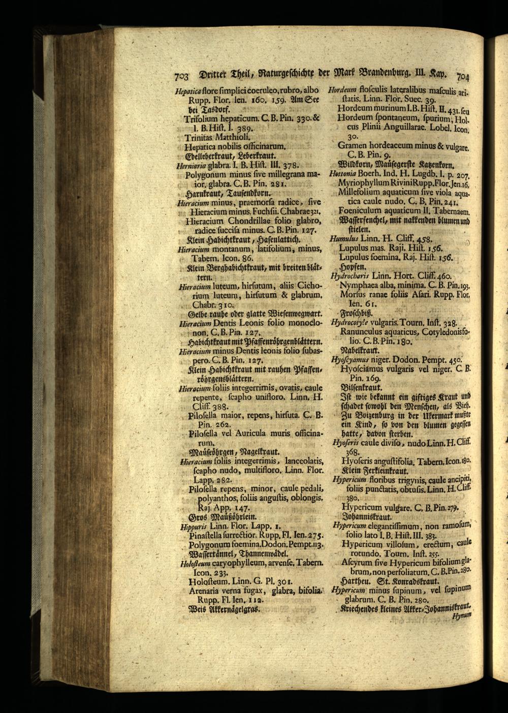 Hordeum floſculis lateralibus maſculis ar ſtatis. Linn. Flor. Suec. 39.. Hordeum murinum LB. Hiſt. ll. 431. fu Hordeum ſpontaneum, ſpurium Hol. cus Plinii Anguillarae. Lobel. Icon Gramen hordeaceum minus& vulgare C. B Pini 8 ö. Wildkorn, Mauͤſegerſte Katzenkorn. Hottonia Boerh. Ind. H. Lugdb. I. p. 207 Myriophyllum kivinikupp. Flor. Jen.16, ¶Millefolium aquaticum{five viola aqua. tica caule nudo. C. B. Pin. 241. PFoeniculum aquaticum II. Tabernaem. Waſſerfenchel, mit nakkenden blumen und ſtielen.. Humulus Linn. H. Cliff. 458. Lupulus mas. Raj. Hiſt. 156. Lupulus foemina. Raj. Hiſt. 156.