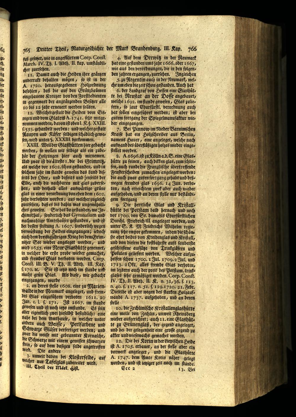XXIII. Weil der Glaßhuͤtten hier gedacht worden, ſo wollen wir ſelbige als ein zubehör der Holzungen hier auch mitnemen. Und zwar iſt die aͤlteſte J. die bei Grimnitz, als welche vor 1602. ſchon geſtanden, und in ſolchem jahr im ſtande geweſen das Land diſſeits der Oder, und diſſeits und jenſeits der Elbe, anch die nachbaren mit glas zuvberſehen, und deshalb alles auswaͤrtige gruͤne glas in einer verordnung von eben dem 1 602. jahr verbohten worden; aus welcher zugleich zuerſehen, daß es bis dahin was ungewoͤhnliches geweſen. Sie hat da geſtanden, wo Jochimsthal, ſonderlich das Gymnaſium und nachmahlige Amtshauͤſer geſtanden, und iſt bei deſſen ſtiftung A. 1607. ſonderlich wegen verwuͤſtung der Heiden eingegangen; iedoch nach dem dreißigſaͤhrigen Krieg bei dem Grimnitzer See wieder angeleget worden, und wird 1655. eine Neue Glashütte genennet, in welcher die erſte probe wieder gemachet, und fremdes Glas verboten worden. Corp. Conſt. IIl. B. V. Th. II. Abth. III. Kap. ſ. 170. ꝛc. Sie iſt ietzs noch im ſtande und macht gruͤn Glas. Als dieſe, wie gedacht eingegangen, wurde