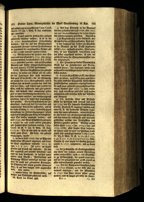 9. Die herrliche Glas und KriſtallHütte bei Potſtam bald hernach und noch bor 1700. von Sr. damahls Churfuͤrſtlichen Durchl. Friedrich Ill. angeleget worden, und unter S. K. M. Friedrichs Wilhelm regierung ſehr empor gekommen, indem die ſchoͤnſte ahrt beides von Kreidenglas und Kriſtall, und von dieſem die koſtbahrſte aufs ſauberſte geſchliffene aufſaͤtze von Trinkglaͤfſern und Pokalen geliefert worden. Welcher aufzuhelfen ſchon 1700. 1 Jul. 1709. 2 Jul. und 1713. 20Ft. alles fremde Glas verboten, im leztern auch der preis des Potſtam. trinke glaſes ſehr gemaͤßiget worden. Corp. Conſt. IV. Th. Il. Abth. Il. K. n. 32, 36. ſ. 113, n. 40. ſ. 117. n. 51. ſ. 129. 1 720. 21. Fehr. Dieſelbe iſt aber wegen des ſtarken HolzaufHR A. 1737. aufgehoben, und an deren telle
