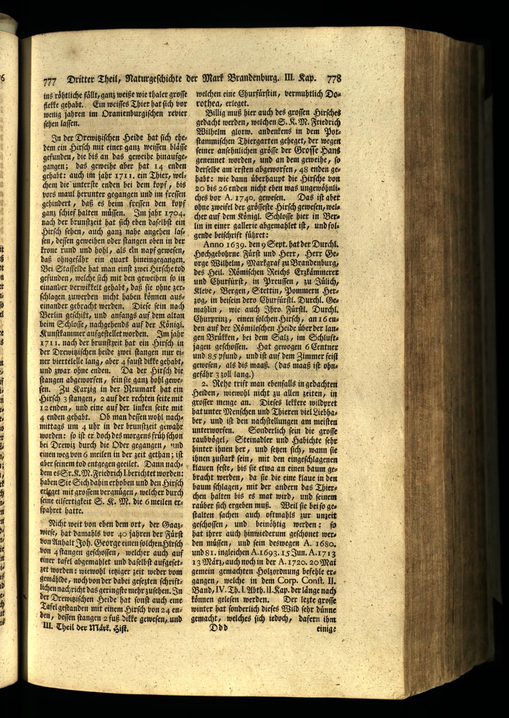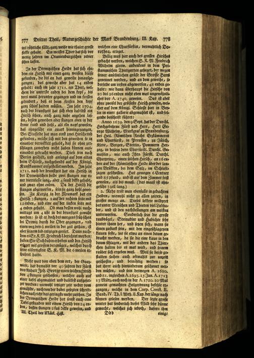 ſen. Zu Karzig in der Neumark hat ein Hirſch 3 ſtangen, 2 auf der rechten ſeite mit 12 enden, und eine auf der linken ſeite mit 4 enden gehabt. Ob man deſſen wohl nachmittags um 4 uhr in der brunſtzeit gewahr worden: ſo iſt er doch des morgens fruͤh ſchon bei Drewiz durch die Oder gegangen, und einen weg von 6 meilen in der zeit gethan; iſt aber ſeinem tod entgegen geeilet. Dann nachdem es Sr. K. M. Friedrich berichtet worden: haben Sie Sich dahin erhoben und den Hirſch erleget mit groſſem vergnuͤgen, welcher durch feine eilfertigkeit S. K. M. die 6 meilen er; ſpahret hatte.