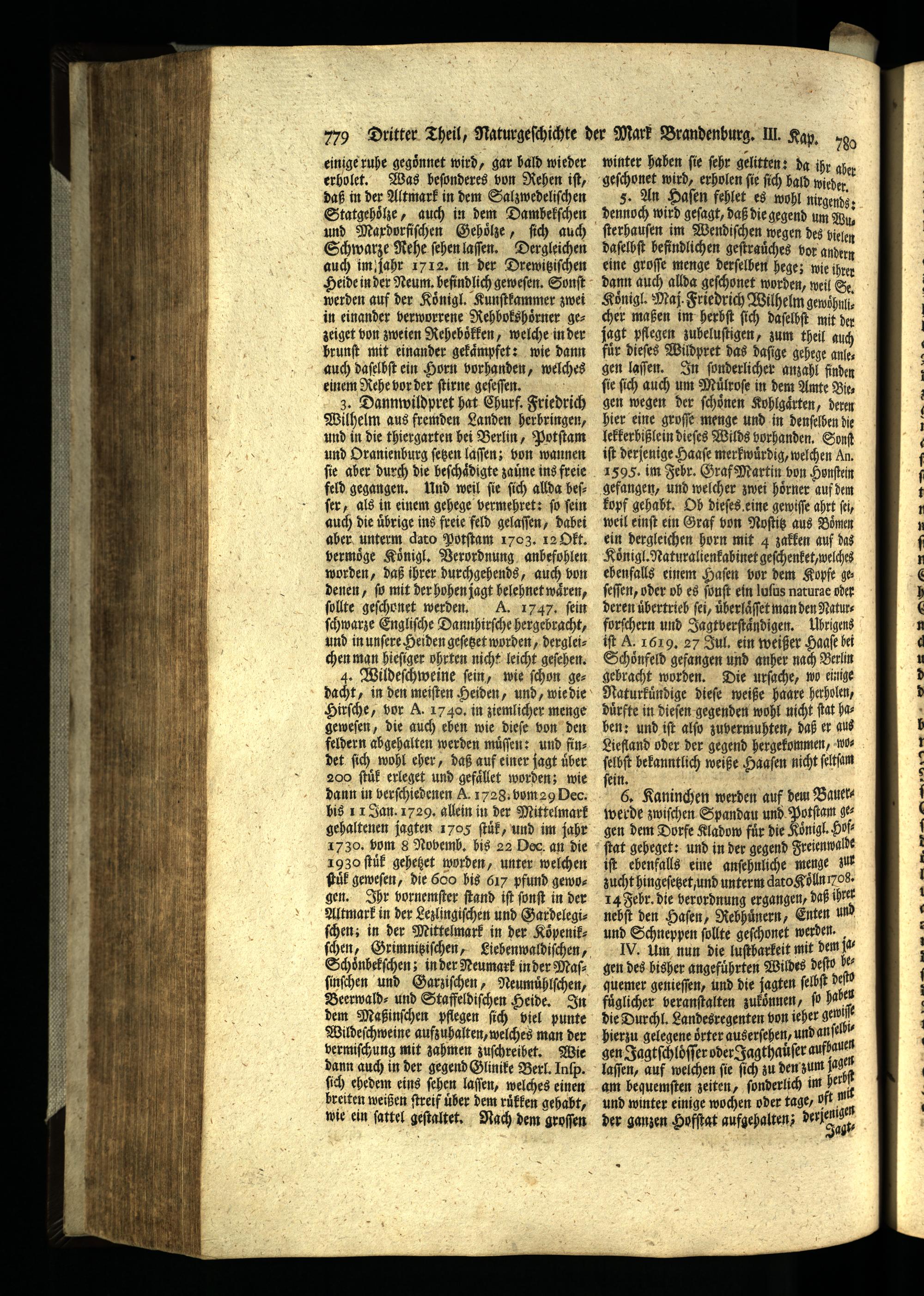 feld gegangen. Und weil ſie ſich allda beſſer, als in einem gehege vermehret: ſo ſein auch die übrige ins freie feld gelaſſen, dabei aber. unterm dato Potſtam 1703. 129 Ft. vermoͤge Koͤnigl. Verordnung anbefohlen worden, daß ihrer durchgehends, auch von denen, ſo mit der hohen jagt belehnet wären, ſollte geſchonet werden. A. 1747. ſein