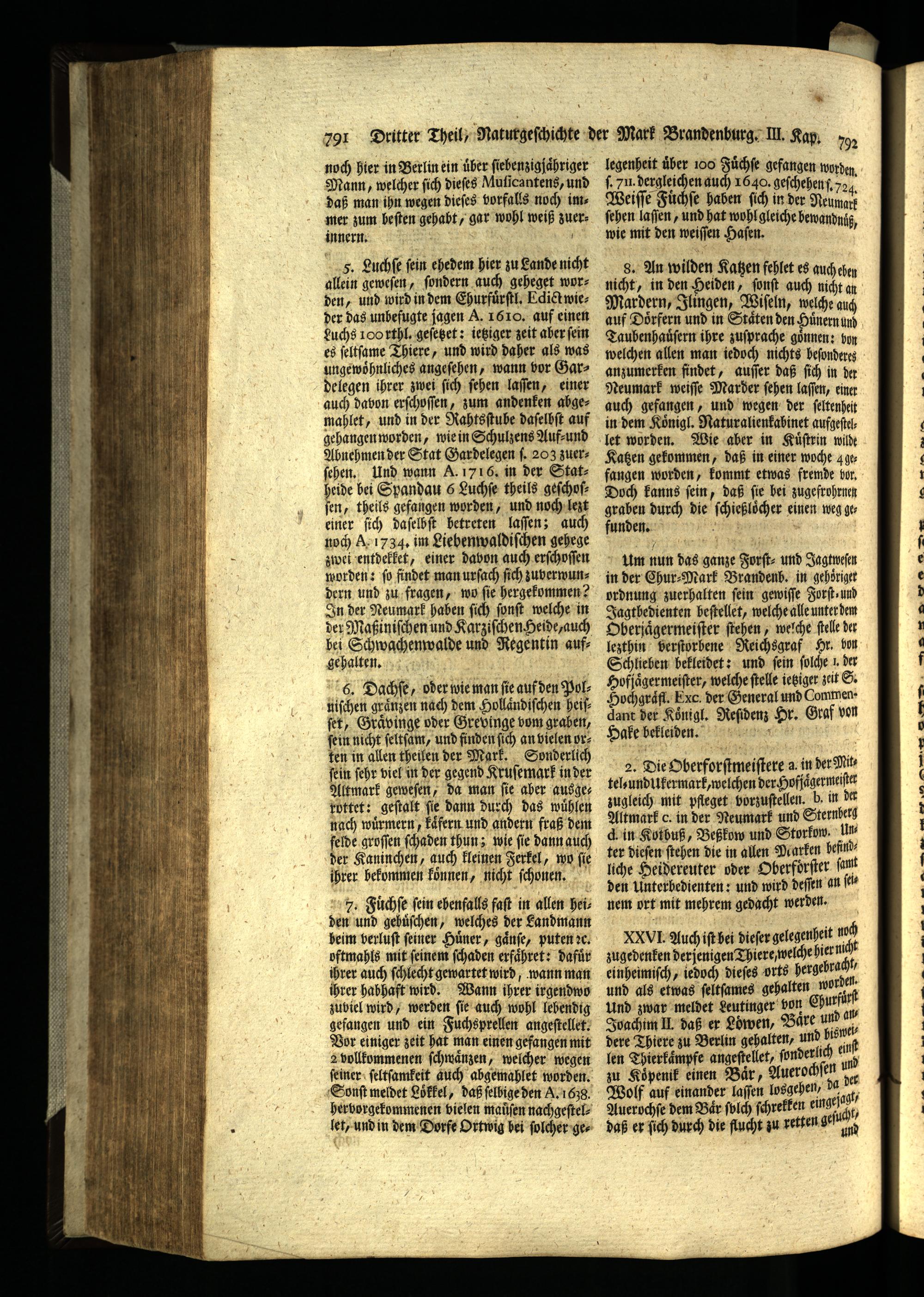 8. An wilden Katzen fehlet es auch ehen nicht, in den Heiden, ſonſt auch nicht an Mardern, Ilingen, Wiſeln, welche auch auf Dörfern und in Staͤten den Hünern und Taubenhauͤſern ihre zuſprache goͤnnen: von welchen allen man iedoch nichts beſonderez anzumerken findet, auſſer daß ſich in der Neumark weiſſe Marder ſehen laſſen, einer auch gefangen, und wegen der ſeltenheit in dem Koͤnigl. Naturalienkabinet aufgeſtellet worden. Wie aber in Kuͤſtrin wilde Katzen gekommen, daß in einer woche 4ge