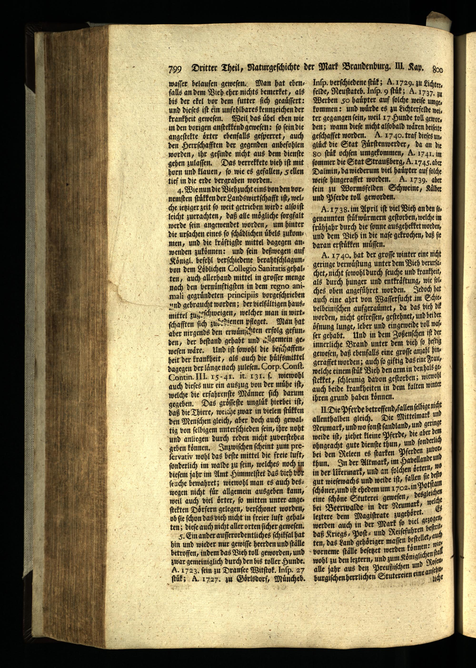 A. 1740. hat der groſſe winter eine nicht geringe werwuͤſtung unter dem Vieh verurſachet, nicht ſowohl durch ſeuche und krankheit, als durch hunger und entkraͤftung, wie ſolches oben angefuͤhret worden. Jedoch hat auch eine ahrt von Waſſerſucht im Schies velbeiniſchen aufgerauͤmet, da das bieh dt worden, nicht gefreſſen, geſtehnet, und beider öͤfnung lunge, leber und ein geweide vol wa fer gehabt. Und in dem Zoßenſchen if de innerliche Brand unter dem vieh ſo heftn geweſen, daß ebenfalls eine groſſe amahl hingeraffet worden; auch fo giftig das eine rau, welche einem ſtüt Vich den arm in den halß ge ſtekket, ſchleunig davon geſtorhen; wiewohl auch beide krankheiten in dem kalten winter ihren grund haben koͤnnen.