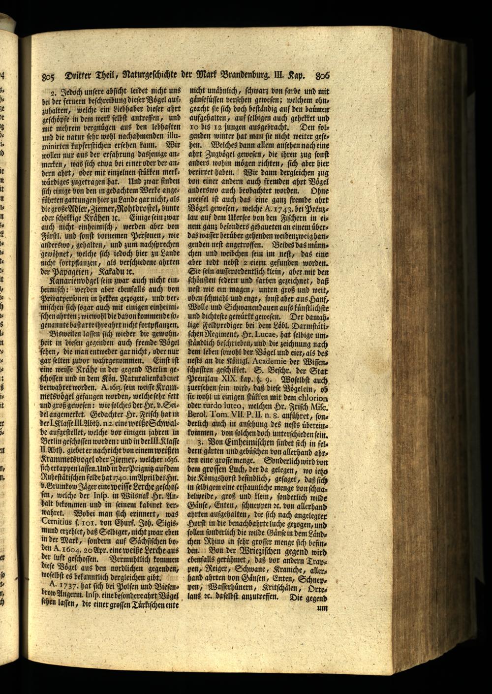 merken, was ſich etwa bei einer oder der andern ahrt, oder mit einzelnen ſtuͤlken merkwuͤrdiges zugetragen hat. Und zwar finden ſich einige von den in gedachtem Werke angefuͤhrten gattungen hier zu Lande gar nicht, als die große Adler, Ziemer, Rohtdroſtel, bunte oder ſchelkige Kraͤhen ꝛc. Einige ſein zwar auch nicht einheimiſch, werden aber von Fuͤrſtl. und ſonſt vornemen Perſonen, wie anderswo, gehalten, und zum nachſprechen gewoͤhnet, welche ſich iedoch hier zu Lande nicht fortpflanzen, als verſchiedene ahrten der Papageien, Kakadu ꝛc. ö Kanarienvogel fein zwar auch nicht einheimiſch: werden aber ebenfalls auch von Privatperſonen in hekken gezogen, und vermiſchen ſich ſogar auch mit einigen einheimi
