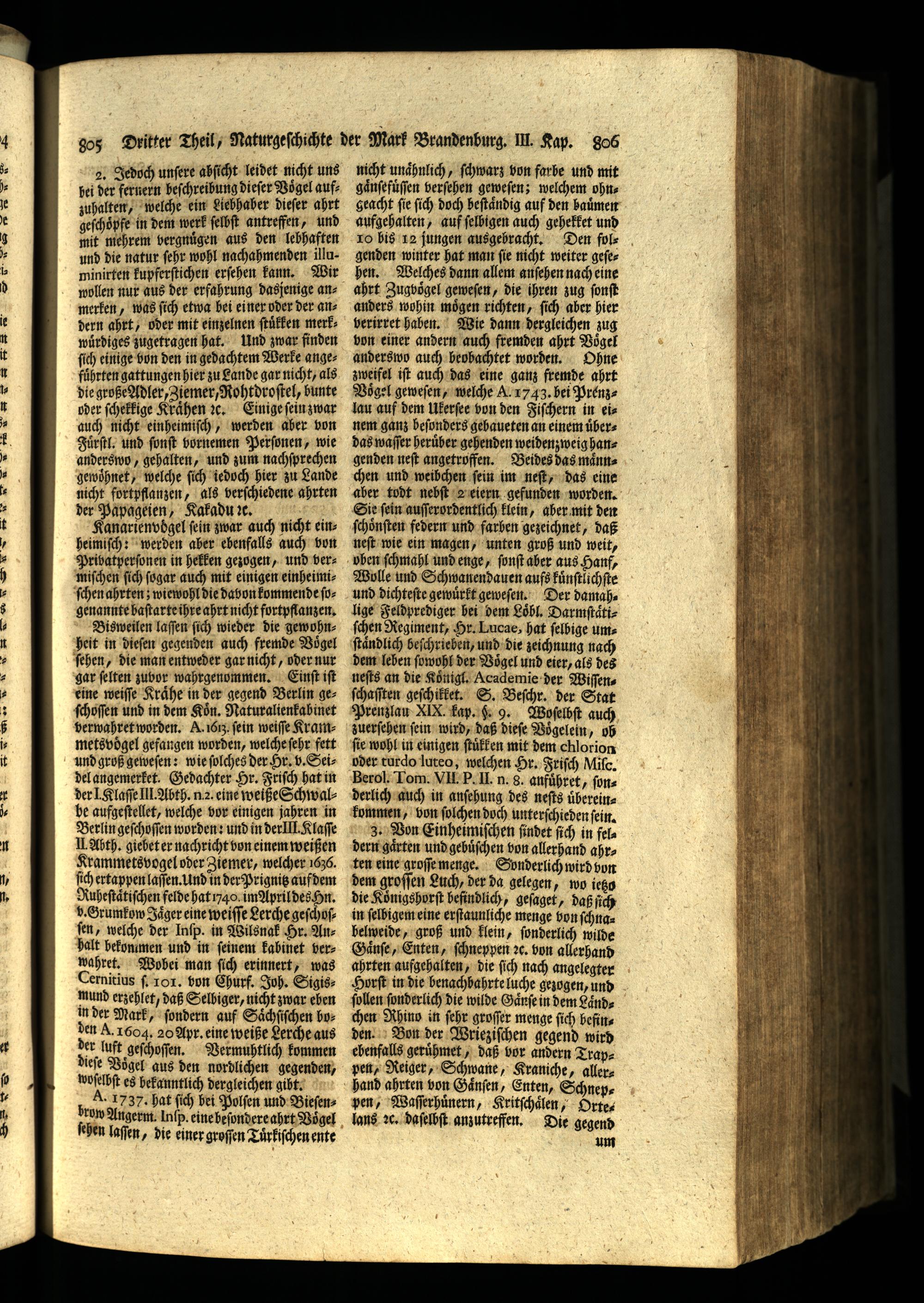 3. Von Einheimiſchen findet ſich in feldern gaͤrten und gebuͤſchen von allerhand ahrten eine groſſe menge. Sonderlich wird von dem groſſen Luch, der da gelegen, wo ietzo die Köͤnigshorſt befindlich, geſaget, daß ſich in ſelbigem eine erſtaunliche menge von ſchnabelweide, groß und klein, ſonderlich wilde Gaͤnſe, Enten, ſchneppen ꝛc. von allerhand ahrten aufgehalten, die ſich nach angelegter Horſt in die benachbahrte luche gezogen, und ſollen ſonderlich die wilde Gaͤnſe in dem Laͤndchen Rhino in ſehr groſſer menge ſich befinden. Bon der Wrieziſchen gegend wird ebenfalls geruͤhmet, daß vor andern Trappen, Reiger, Schwane, Kraniche, aller.