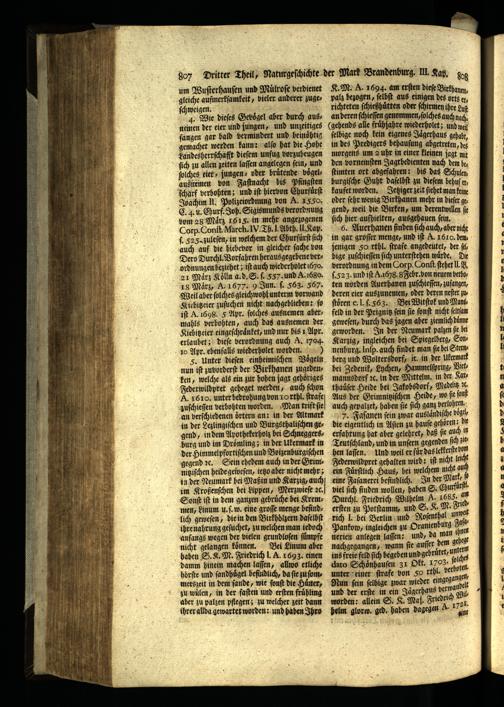 4. Wie dieſes Gevoͤgel aber durch ausnemen der eier und jungen, und unzeitiges fangen gar bald vermindert und beinöhtig gemachet werden kann: alſo hat die Hohe Landesherrſchafft dieſem unfug vorzubeugen ſich zu allen zeiten laſſen angelegen ſein, und ſolches eier, jungen⸗ oder hruͤtende voͤgelaushemen von Zaſtnacht bis Pfingſten ſcharf verbohten; und iſt hiervon Ghurfuͤrſt Jbachim Il. Polizeiordnung von A. 1550. G. 4. u. Churf. Joh. Sigismunds verordnung vom 28 Maͤrz 1615. in mehr angezogenen Corp. Conſt. March. Th. 1. Abth. ll. Kap.