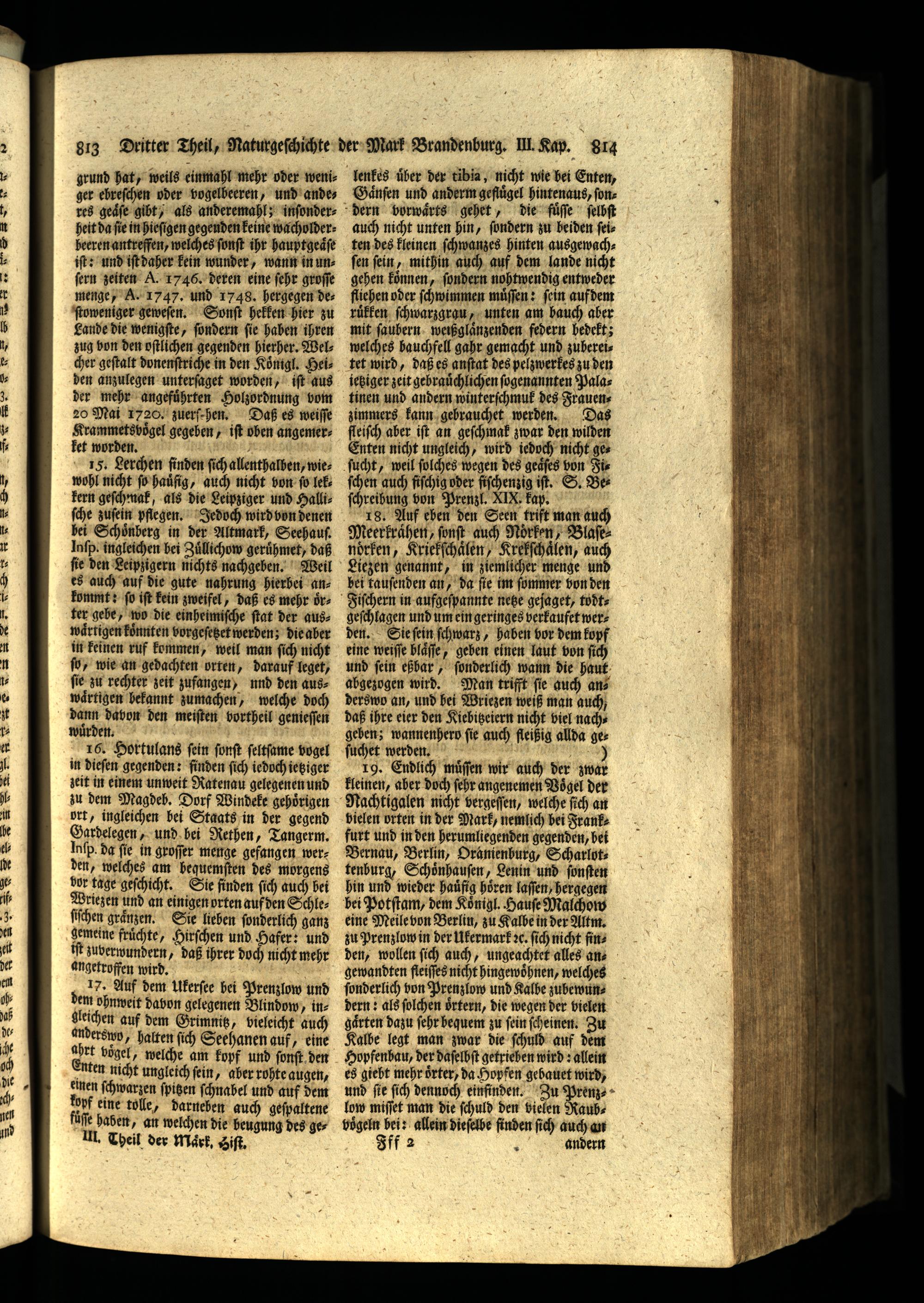 15. Lerchen ſinden ſich allenthalben, wiewohl nicht ſo haufig, auch nicht von ſo lek= kern geſchmak, als die Leipziger und Halli: ſche zuſein pflegen. Jedoch wird von denen bei Schönberg in der Altmark, Seehauſ. Inſp. ingleichen bei Zuͤllichow geruͤhmet, daß ſie den Leipzigern nichts nachgeben. Weil es auch auf die gute nahrung hierbei ankommt: ſo iſt kein zweifel, daß es mehr dr: ter gebe, wo die einheimiſche ſtat der auswaͤrtigen koͤnnten vorgeſetzet werden; die aber in keinen ruf kommen, weil man ſich nicht ſo, wie an gedachten orten, darauf leget, ſie zu rechter zeit zufangen, und den auswaͤrtigen bekannt zumachen, welche doch dann davon den meiſten vortheil genieſſen wurden.