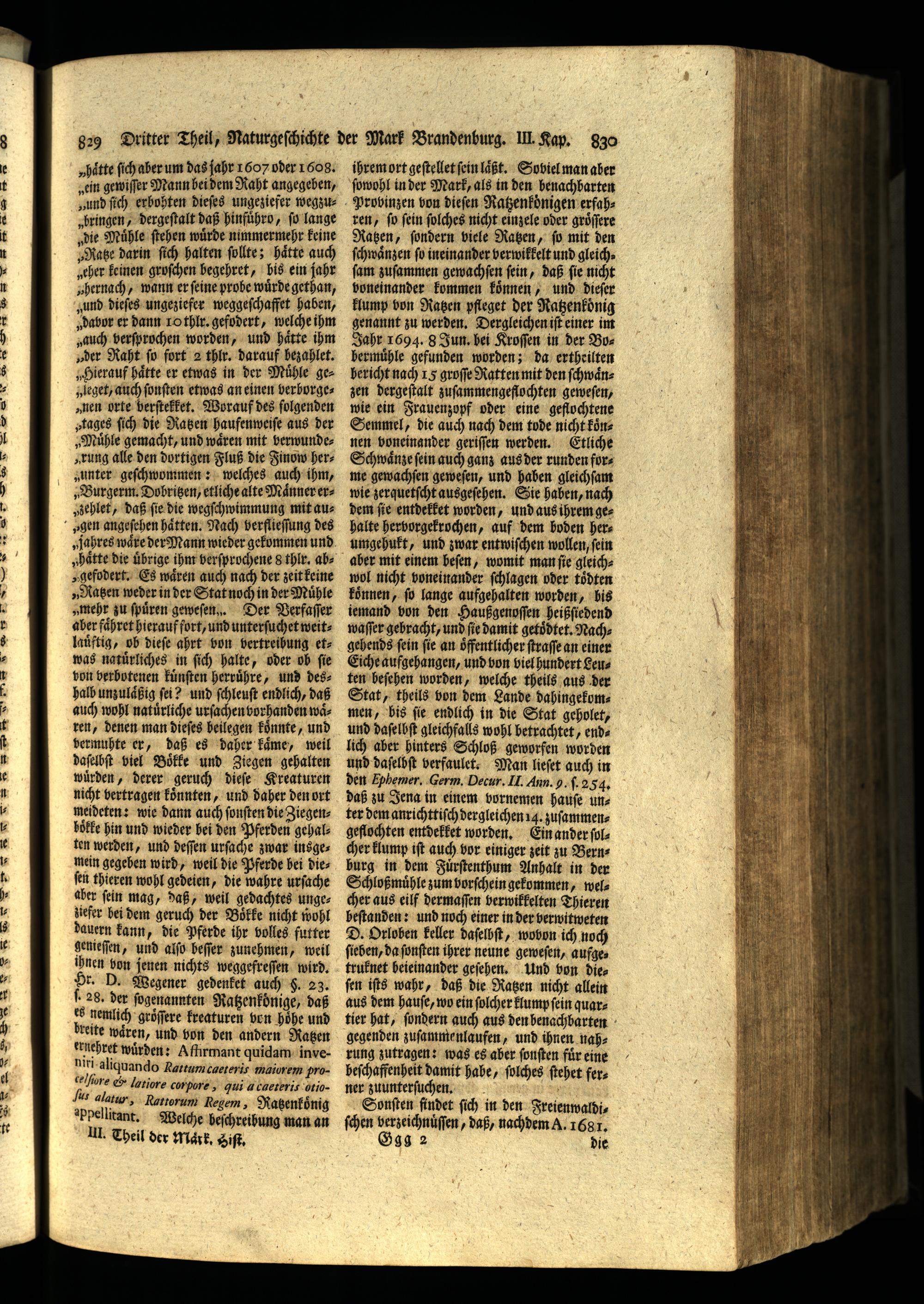 ihrem ort geſtellet fein laͤßt. So iel man aber ſowohl in der Mark, als in den benachbarten Proinzen von dieſen Ratzenkoͤnigen erfahren, ſo fein ſolches nicht einzele oder groͤſſere Ratzen, ſondern viele Ratzen, ſo mit den ſchwaͤnzen ſo ineinander verwikkelt und gleich» ſam zuſammen gewachſen ſein, daß ſie nicht voneinander kommen koͤnnen, und dieſer klump von Raben pfleget der Ratzenköͤnig genannt zu werden. Dergleichen iſt einer im Jahr 1694. 8 Jun. bei Kroſſen in der Bobermuͤhle gefunden worden; da ertheilten bericht nach 15 groſſe Ratten mit den ſchwaͤnzen dergeſtalt zuſammengeflochten geweſen, wie ein Frauenzopf oder eine geflochtene Semmel, die auch nach dem tode nicht koͤnnen voneinander geriſſen werden. Etliche Schwänze fein auch ganz aus der runden forme gewachſen geweſen, und haben gleichſam wie zerquetſcht ausgeſehen. Sie haben, nach dem fie entdekket worden, und aus ihrem ges halte hervorgekrochen, auf dem boden herumgehukt, und zwar entwiſchen wollen, ſein aber mit einem heſen, womit man ſie gleichwol nicht voneinander ſchlagen oder toͤdten koͤnnen, fo lange aufgehalten worden, bis iemand von den Haußgenoſſen heißſiedend waſſer gebracht, und fie damit getöodtet. Nachgehends fein fie an oͤffentlicher ſtraſſe an einer Eiche aufgehangen, und von viel hundert Leuten beſehen worden, welche theils aus der Stat, theils von dem Lande dahingekommen, bis ſie endlich in die Stat geholet, und daſelbſt gleichfalls wohl betrachtet, endlich aber hinters Schloß geworfen worden und daſelbſt verfaulet. Man lieſet auch in den Ephemer, Germ. Decur. Il. Ann. 9. ſ. 254. daß zu Jena in einem vornemen hauſe unter dem anrichttiſch dergleichen 14. zuſammengeflochten entdelket worden. Ein ander ſolcher klump iſt auch vor einiger zeit zu Bernburg in dem Fuͤrſtenthum Anhalt in der Schloßmuͤhle zum vorſchein gekommen, welcher aus eilf dermaſſen verwikkelten Thieren beſtanden: und noch einer in der verwitweten D. Orloben keller daſelbſt, wobon ich noch ſieben, da fünften ihrer neune geweſen, aufgetruknet beieinander geſehen. Und von dieſen iſts wahr, daß die Ratzen nicht allein aus dem hauſe, wo ein ſolcher klump ſein quartier hat, ſondern auch aus den benachbarten gegenden zuſammenlaufen, und ihnen nahrung zutragen: was es aber ſonſten fuͤr eine beſchaffenheit damit hahe, ſolches ſtehet ferner zuunterſuchen. Sonſten ſindet ſich in den Freienwaldiſchen verzeichnuͤſſen, daß, nachdem A. 1681. Ggg 2 die