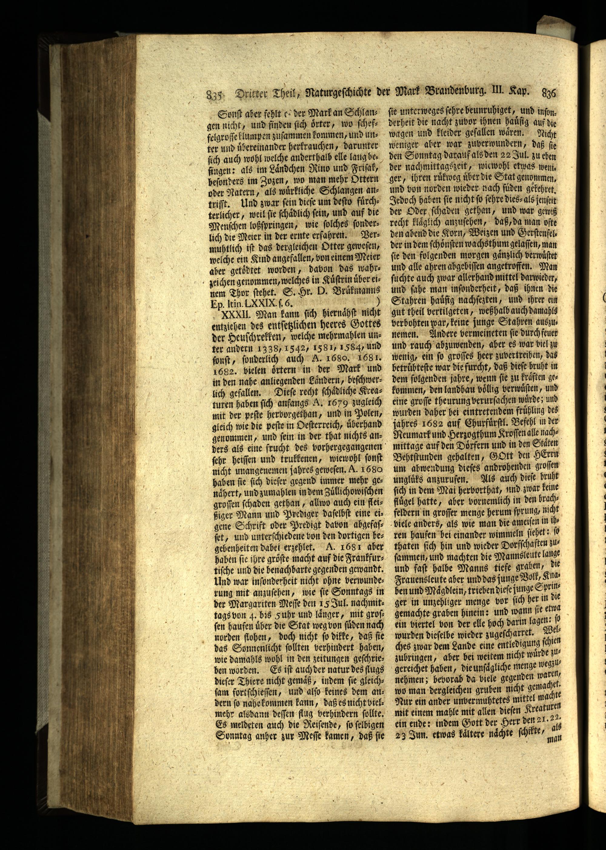 XXXII. Man kann ſich hiernaͤhſt nicht entziehen des entſetzlichen heeres Gottes der Heuſchrekken, welche mehrmahlen unter andern 1338, 1542, 1581, 1584, und ſonſt, ſonderlich auch A. 1680. 1681. 1682. bielen oͤrtern in der Mark und in den nahe anliegenden Landern, beſchwerlich gefallen. Dieſe recht ſchaͤdliche Kreaturen haben ſich anfangs A. 1679 zugleich mit der peſte herborgethan, und in Polen, gleich wie die peſte in Oeſterreich, uͤberhand genommen, und ſein in der that nichts an