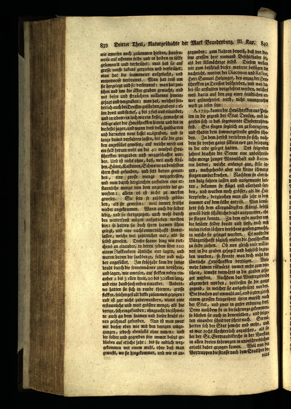 A. 729. kamen die Heuſchrekken aus Pohlen in die gegend der Stat Droſſen, und lagerten ſich in das ſogenannte Siebenruhten. feld. Sie fingen ſogleich an zu fouragiren, und thaten dem ſommergetreide großen ſchaden. In dem herbſt verlohren fie ſich, nachdem fie dorher ganze ſaͤlein eier zur heſatzung in die erde geleget hatten. Des folgenden jahres brachte die Sonne eine unheſchreib