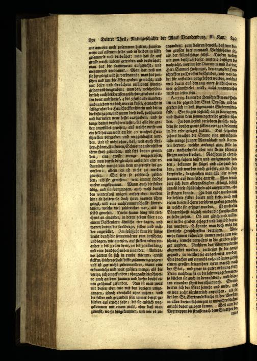 ihren fraß gefunden, und fett dabon geworden, eine groſſe menge weggefreſſen, und man durch dergleichen anſtalten eine erſtaunliche menge von dem ungeziefer los geworden: allein es iſt nicht zu merken geweſen. Sie ſein ſo zahlreich geblieben, als ſie geweſen: weil immer friſche wieder angekommen. Wann auch die felder ledig, und ſie fortgezogen, auch wohl durch den winterfroſt mogen aufgerieben worden ſein: ſo hatten ſie doch ihren ſaamen ſchon gelegt, und eine nachkommenſchafft hinterlaſſen, welche viel zahlreicher war, als ſie ſelbſt geweſen. Dieſer ſaame hing wie tietchens an einander, in deren jedem Über 100 einem Rokkenkorn aͤhnliche eier lagen, und waren dayon die ſandberge, felder und waͤlder angefuͤllet. Im fruͤhjahr kam die junge hruht durch die ſonnenwaͤrme zum vorſchein, und lagen, wie ameiſen, auf flelken neben einander 2 bis 3 ellen breit, 20 bis zo ellen lang, und eine hand hoch neben einander. Anderswo hatten ſie ſich in runde thienen, groſſe flelken, ſolchergeſtalt dikke zuſammen gezogen: und iſt gar nicht zuberwundern, wann eine erſtaunliche und weit gröffere menge, als die vorige, ſich eingefunden; ohngeacht die ſchweine auch an dem ſaamen und dieſer bruht einen geſchmak gefunden. Nun iſt man zwar mit dieſen eben wie mit den vorigen umgegangen, jedoch ebenfalls ohne nutzen: und die felder und gegenden ſein immer beſezt geblieben auf etliche jahr; bis fie endlich weggekommen mit einem mahl, ohne daß man gewußt, wo ſie hingekommen, und wie es zu