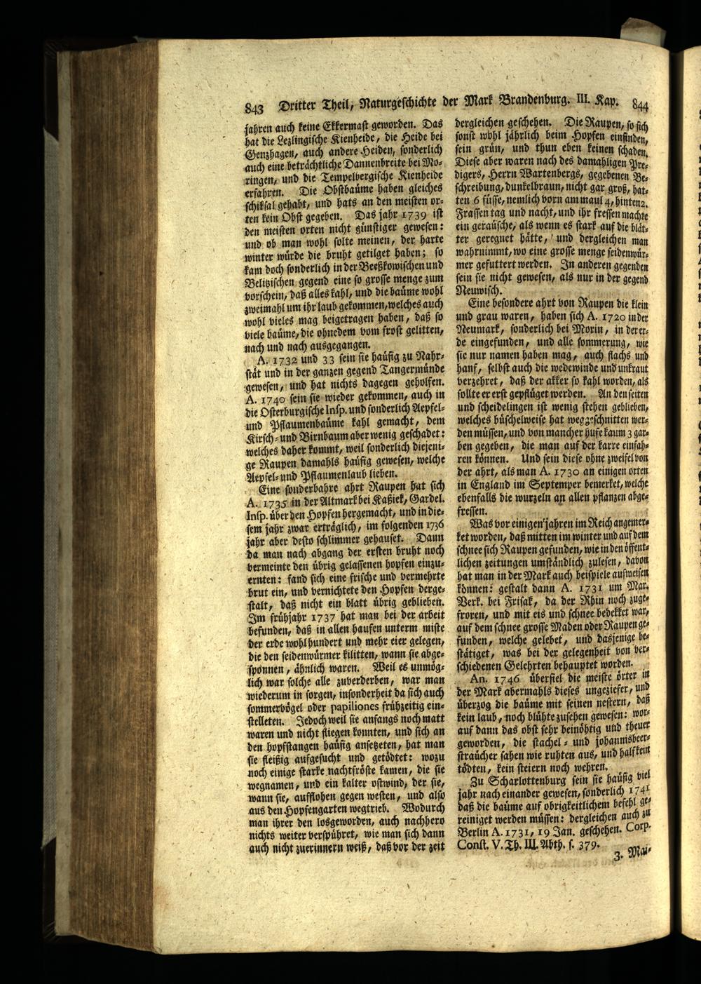 de eingefunden, und alle ſommerung, wie ſie nur namen haben mag, auch flachs und hanf, ſelbſt auch die wedewinde und unkraut verzehret, daß der akker ſo kahl worden, als ſollte er erſt gepfluͤget werden. An den ſeiten und ſcheidelingen iſt wenig ſtehen geblieben, welches buͤſchelweiſe hat weg geſchnitten werden muͤſſen, und bon mancher hufe kaum z garben gegeben, die man auf der karre einfahren koͤnnen. Und fein dieſe ohne zweifel bon der ahrt, als man A. 1730 an einigen orten in England im Septemper hemerket, welche ebenfalls die wurzeln an allen pflanzen abgefreſſen.; Was vor einigen jahren im Reich angemerket worden, daß mitten im winter und auf dem ſchnee ſih Raupen gefunden, wie in den öffentlichen zeitungen umſtaͤndlich zuleſen, dabon hat man in der Mark auch beiſpiele aufweiſen koͤnnen geſtalt dann A. 1731 um Mar. Verk. bei Friſak, da der Rhin noch zugefroren, und mit eis und(nee bedekket war/ auf dem ſchnee groſſe Maden oder Raupen 06 funden, welche gelebet, und dasjenige Des {tätiget, was bei der gelegenheit bon betſchiedenen Gelehrten behauptet worden. An. 1746 uͤberfiel die meiſte oͤrter in der Mark abermahls dieſes ungeziefer, und überzog die baume mit feinen neſtern, da kein laub, noch blühte zuſehen geweſen: wor, auf dann das obſt ſehr beindͤhtig und theuet geworden, die ſtachel- und ſohannishert, ſtraücher ſahen wie ruhten aus, und half kei toͤdten, kein ſteiern noch wehren.. Zu Scharlottenhurg fein fie haufig viel lar nach einander geweſen, ſonderlich 174 daß die baume auf obrigleitlichem befehl gereiniget werden muſſen: dergleichen auch; Berlin A. 1731, 19 Jan. geſchehen. Corp; Conſt. V. Th. Ill. Abth. ſ. 379 3. Maj
