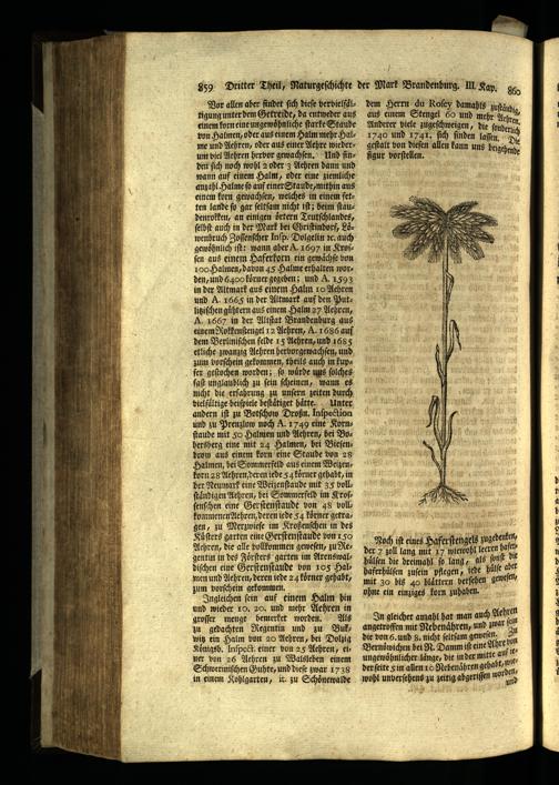 einem Rokkenſtengel 12 Aehren, A. 1686 auf dem Berliniſchen felde 15 Aehren, und 1685 etliche zwanzig Aehren herborgewachſen, und zum vorſchein gekommen, theils auch in kupfer geſtochen worden; ſo wuͤrde uns ſolches faſt unglaublich zu ſein ſcheinen, wann es nicht die erfahrung zu unſern zeiten durch vielfaͤltige beiſpiele beſtaͤtiget haͤtte. Unter andern iſt zu Botſchow Droßn. Inſpection und zu Prenzlow noch A. 1749 eine Kornſtaude mit so Halmen und Aehren, bei Bobersberg eine mit 24 Halmen, bei Bieſenbrorz aus einem korn eine Staude bon 28 Halmen, bei Sommerfeld aus einem Weizenkorn 28 Aehren deren iede 54 koͤrner gehabt, in der Neumark eine Weizenſtaude mit 35 voll. ſtaͤndigen Aehren, bei Sommerfeld im Kroſſenſchen eine Gerſtenſtaude von 48 vollkommenen Aehren, deren iede 54 koͤrner getragen, zu Merzwieſe im Kroßenſchen in des Kuͤſters garten eine Gerſtenſtaude bon 150 Aehren, die alle bollkommen geweſen, zu Regentin in des Foͤrſters garten im Arenswaldiſchen eine Gerſtenſtaude von 105 Halmen und Aehren, deren iede 24 koͤrner gehabt, zum vorſchein gekommen.. Ingleichen ſein auf einem Halm hin und wieder 19. 20. und mehr Aehren in groſſer menge bemerket worden. Als zu gedachten Regentin und zu Buk— witz ein Halm bon 20 Aehren, bei Dolzig Koͤnigsb. Inſpect. einer von 25 Aehren, ei: ner von 26 Aehren zu Walsleben einem Schweriniſchen Guhte, und dieſe zwar 1738 in einem Kohlgarten, it. zu Schoͤnewalde