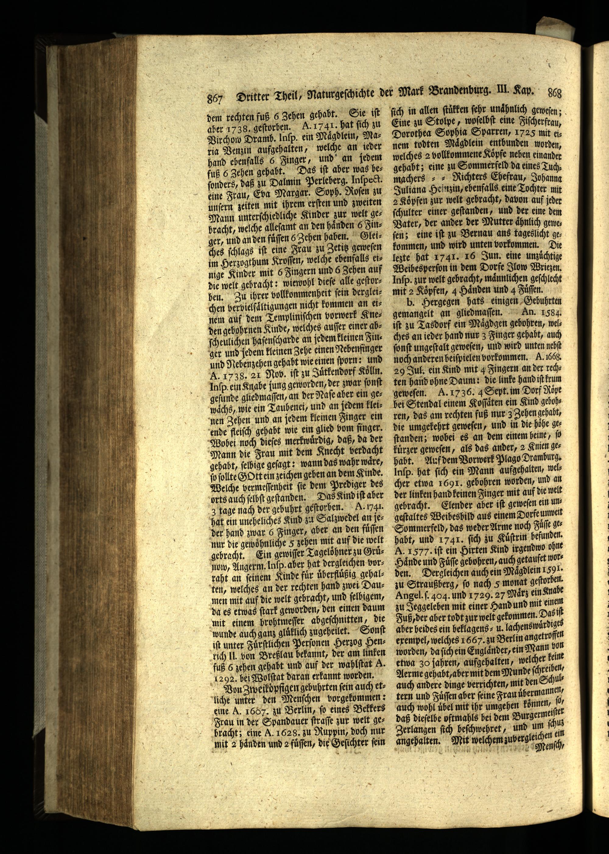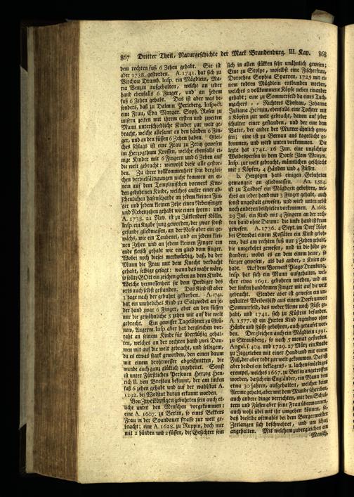 aber 1738. geſtorben. A.ı741. hat ſich zu Virchow Dramb. Inſp. ein Maͤgdlein, Maria Venzin aufgehalten, welche an ieder hand ebenfalls 6 Finger, und an jedem fuß 6 Zehen gehabt. Das iſt aber was beſonders, daß zu Dalmin Perleberg. Inſpect. eine Frau, Epa Margar. Soph. Roſen zu unſern zeiten mit ihrem erſten und zweiten Mann unterſchiedliche Kinder zur welt gebracht, welche alleſamt an den haͤnden 6 Finger, und an den fuͤſſen s Zehen haben. Glei