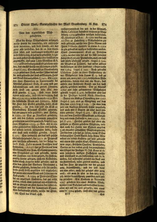 ralſuperintendent der zeit in der Altmark, Andr. Celichius beſonders in einem zu Magdehurg 1579 gedrukten werkgen heſchriehen. S. Leutinger ad h. a. A. 1580 wurden am 12 Dec. zu Havelberg 2 Mißgebuhrten zur welt gebracht, welche bon Peter Rinow und Peter Victorio ebenfalls in einem A. 158 in ꝗto gedrukten werkgen beſchriehen worden. Eines Zimmermanns Kind zu Prenzlow 1583, welches eine bis auf die füße herunter hangende Haut, wie Pumphoſen, auch am hals und haͤnde Gekrauͤſe gehabt. Angel. ſ. 394. ein Maͤgden zu Taßdorf, das unter andern verſtellungen an ieder hand nur 3 finger hatte bon 1584. Angel. ſ. 395. Auch gedenket Uldaricus Zahn in ſeiner Beſchreibung einer Mißgebuhrt vom Lamm C. 3, daß zu ſeiner zeit, wenig vor 1583, verſchiedene Mißgebuhrten, dabon eins nur ein Auge, das andere eine fleiſcherne Krauſe um den halßb gehabt, gebohren worden. Der zu Koͤpenik 1685 ans licht gekommenen Mißgebuhrt gedenkt Angel. ſ. 4908. beſchrieben aber hat ſie der Prediger daſelbſt Mich. Murrhius. Ferner ein Kind zu Straußberg von 1587 Angel. ſ. 398; eins zu Königsberg auf dem Kiez von 1588 Ang ſ. 399. In ehen dem jahr ein Knabe zu Koͤpenik, ſo ſehr ungeſtalt, und auch mit 6 ſingern an ieder hand verſehen geweſen. Angel ſ. 401. Ein Knaͤhelein auf dem Dorf des Magiſtrats zu Koͤnigsberg mit einem Haſenohr ꝛc. von 1593. Angel. ſ. 412. Hierher gehöoͤret das oben angefuuͤhrte zu Selow gehohrne Maͤgdlein, welches nach des Herrn von Seidels angeben 2 an einander gewachſene Maͤgdlein geweſen. Ineben dem jahr hat zu Jehen, einem Schulenburgiſchen Dorfe Apenb. Inſp. Anna Meinikens ein todtes Knaͤblein zur welt gebracht mit einem ſehr groſſen Kopf, Sternlein in etz nem auge, fleiſchern Quaſten, Armbaͤnder, Borten an den lenden gleich den pumphoſen: wie ſelbiges der Prediger M. Joh. Kuno in einem beſondern werkgen Hoffahrts wohlund uͤbelſtand in to beſchrieben, und lit. b. meldet, daß waͤhrender gehuhrt ein knall wie ein flintenſchuß, ware gehoͤret worden, und daß der Frau ihr angeſicht vor der gebuhrt ganz braunſchwarz, und der leib bunt wie eine atter, nach der gehuhrt aber ganz weiß, als man ſie aher in den ſarg geleget, wieder braunſchwarz geworden, und heftig gerochen. Ein Knaͤblein zu Nahauſen 1597 gebohren von eines Koffäten Weib, welches feine Bakzaͤhne und borderſten Unterzaͤhne mit auf die welt gebracht, wie eines ohen bei 1584 gehabt, ſonſt aber viel gebreKkk; chen