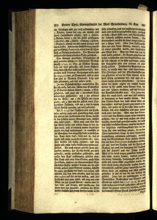 Als A. 1746 das Naßhorn hier ins Land, unter andern auch nach Habelberg kam, fand ſich untern den Zuſchauern eine Frau, welche in den ſechſten monat ſchwanger war, ſolches aber nicht wußte. Weil man nun eben dieſem Thiere hroht und andere dinge in den rachen warf, und es dadurch immer begieriger wurde den fraß aufzufangen: ſo erwiſchte es im ſchnappen von ohngefehr dieſer naheſtehenden Frau ihren kopf, doch nur ſo, daß es haube und muͤtze zugleich herunter riß: worüber dieſelbe ſich heftig entſetzet, und ihre Haube und muͤtze voller beſtuͤrzung wieder aufgeſetzet. Als nach einiger zeit die Frau entbunden worden, hat ſie eine frucht zur welt gebracht, welche weiblichen geſchlechts, und auſſer dem Kopf vollkommen gebildet war. Am Kypfe aber war keine Stirne, auch keine Hirnſchale, fondern ein ſchwammichtes blauroͤhtliches fleiſch, welches beinahe wie die auͤſſerliche geſtalt eines Gehirns ausſahe, bedekte die ganze oberflaͤche des kopfs calvariam, und erſtrekte ſich von dem oberſten theil der naſe oder radice naſi bis an den nakken, und das ſleiſchichte war ganz platt, und hing wie eine Muͤtze um das Haupt herum: wurde aber etwas feſter und kleiner, und bedekte nur den obern theil des Haupts; nachdem die Wehmutter daſſelbe mit einem breiten hande in die