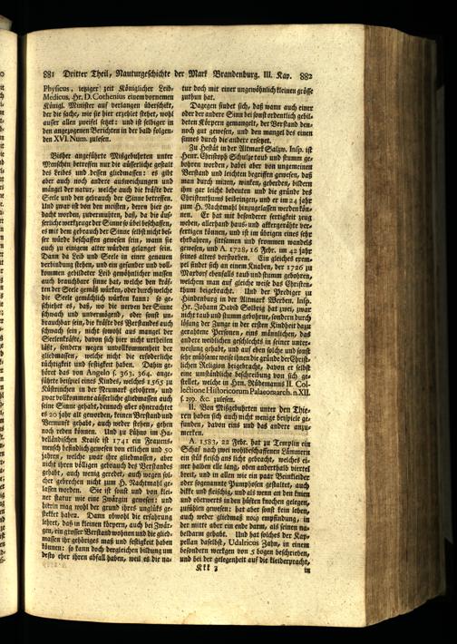 Bisher angeführte Mißgebuhrten unter Menſchen betreffen nur die auͤſſerliche geſtalt des Leibes und deſſen gliedmaſſen: es gibt aber auch noch andere ausweichungen und maͤngel der natur, welche auch die kraͤfte der Seele und den gebrauch der Sinne betreffen. Und zwar iſt bon den meiſten, deren hier gedacht worden, zuvermuhten, daß, da die aͤuſſerliche werkzeuge der Sinne ſo übel beſchaffen, es mit dem gebrauch der Sinne ſelbſt nicht beſſer wuͤrde beſchaffen geweſen ſein, wann ſie auch zu einigem alter wuͤrden gelanget ſein. Dann da Leib und Seele in einer genauen verbindung ſtehen, und ein geſunder und vollkommen gebildeter Leib gewöhnlicher maſſen auch brauchbare ſinne hat, welche den kraͤften der Seele gemäß wůrken, oder durch welche die Seele gemaͤchlich wuͤrken kann: ſo geſchiehet es, daß, wo die nerven der Sinne ſchwach und unvermoͤgend, oder ſonſt un: brauchbar fein, die kraͤfte des Verſtandes auch ſchwach ſein, nicht ſowohl aus mangel der Seelenkraͤfte, davon ſich hier nicht urtheilen laͤßt, ſondern wegen unvollkommenheit der gliedmaſſen, welche nicht die erfoderliche tůchtigkeit und feſtigkeit haben. Dahin geHöret das von Angelo ſ. 363. 364. angeführte beiſpiel eines Kindes, welches 1565 zu Kuͤſtrinchen in der Neumark gebohren, und zwar vollkommene auſſerliche gliedmaſſen auch