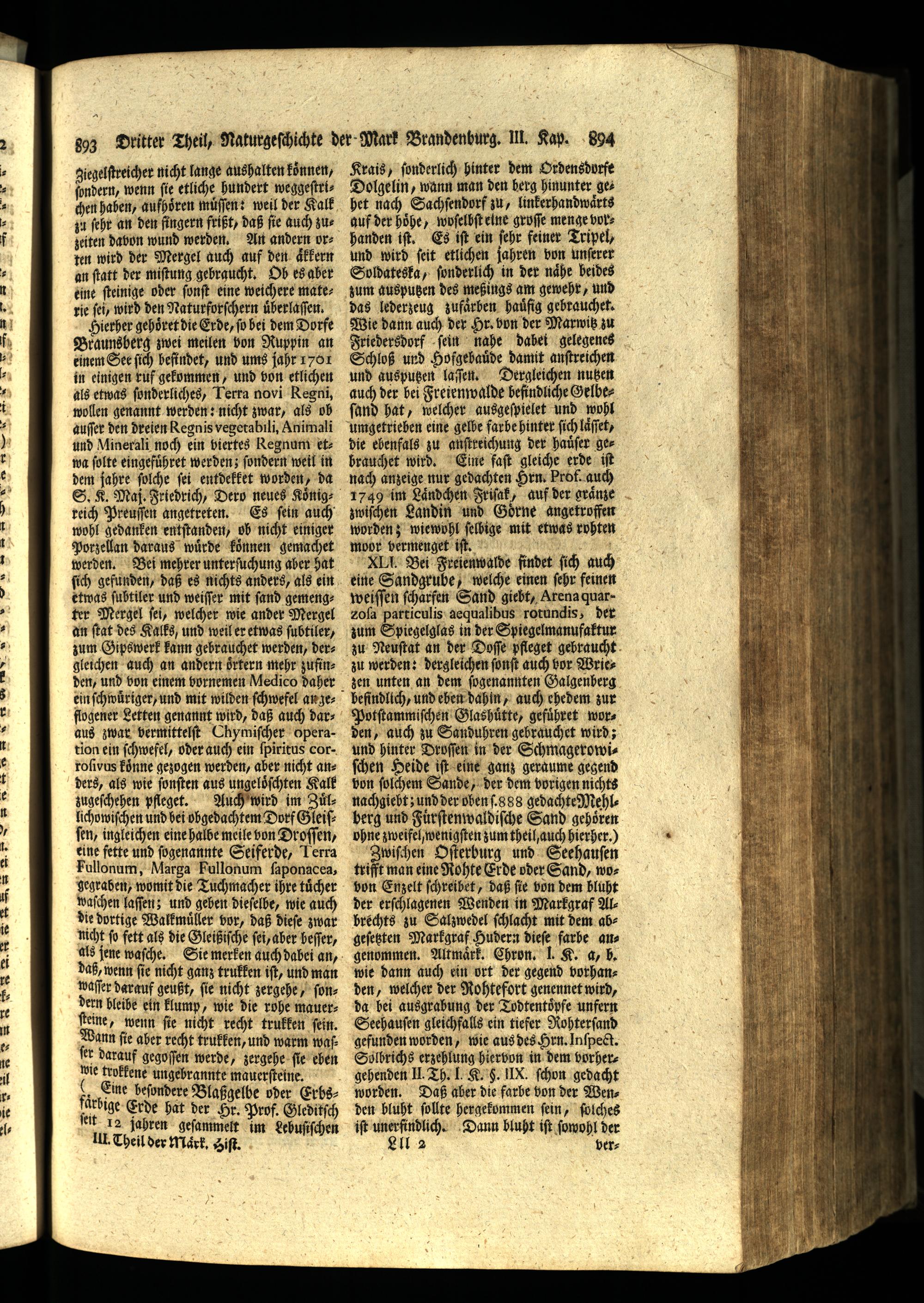 XII. Bei Freienwalde findet{ih auch eine Sandgrube, welche einen ſehr feinen weiſſen ſcharfen Sand giebt, Arena quarzoſa particulis acqualibus rotundis, der zum Spiegelglas in der Spiegelmanufaktur