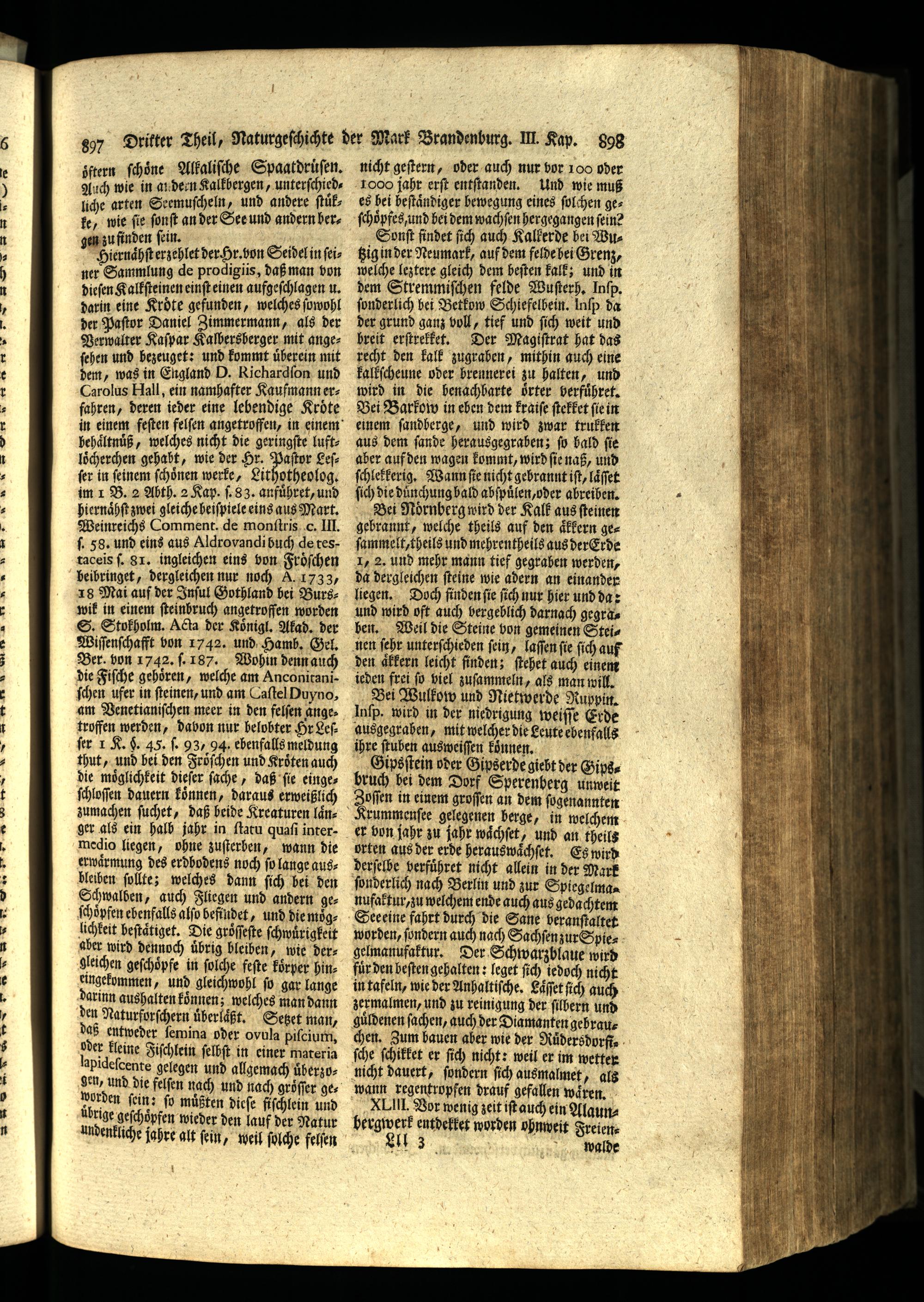 öftern ſchoͤne Alkaliſche Spaatdruͤſen. .. andern Kalkbergen, unterſchiedliche arten Seemuſcheln, und andere ſtuͤkke, wie ſie ö. an der See und andern berzu finden ſein.. e . erzehlet der Hör. von Seidel in ſeiner Sammlung de prodigiis, daß man von dieſen Kalkſteinen einſt einen aufgeſchlagen u. darin eine Kroͤte gefunden, welches ſowohl der Paſtor Daniel Zimmermann, als der Verwalter Kaſpar Kalbersberger mit ange: ſehen und bezeuget: und kommt überein mit dem, was in England D. Richardſon und Carolus Hall, ein namhafter Kaufmann erfahren, deren ieder eine lebendige Kroͤte