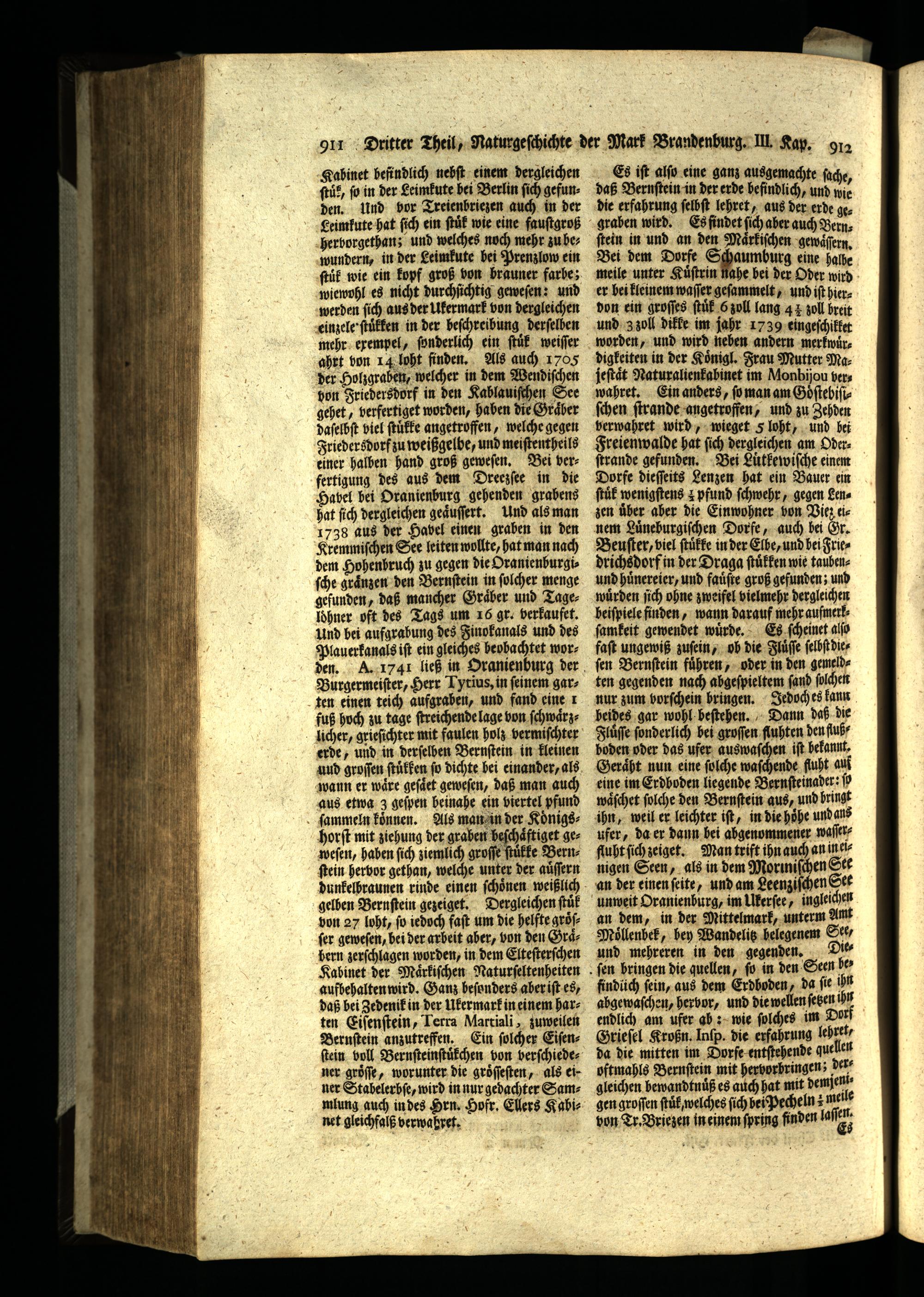 wiewohl es nicht durchſichtig geweſen: und werden ſich aus der Ulermark von dergleichen einzele ſtuͤkken in der beſchreibung derſelben mehr exempel, ſonderlich ein ſtuͤf weiſſer ahrt von 14 loht finden. Als auch 1705 der Holzgraben, welcher in dem Wendiſchen von Friedersdorf in den Kablauiſchen See gehet, verfertiget worden, haben die Graͤber daſelbſt viel ſtuͤkke angetroffen, welche gegen Friedersdorf zu weißgelbe, und meiſtentheils einer halben hand groß geweſen. Bei verfertigung des aus dem Dreezſee in die Havel bei Oranienburg gehenden grabens hat ſich dergleichen geaͤuuſſert. Und als man 1738 aus der Havel einen graben in den Kremmiſchen See leiten wollte, hat man nach dem Hohenbruch zu gegen die Oranienburgiſche graͤnzen den Bernſtein in ſolcher menge gefunden, daß mancher Graͤber und TageJöhner oft des Tags um 16 gr. verkaufet. Und bei aufgrabung des Finokanals und des