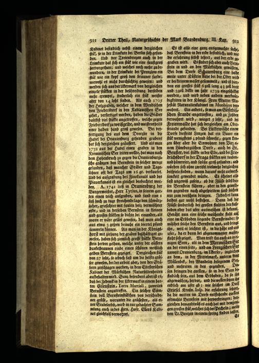 Es iſt alſo eine ganz ausgemachte ſache daß Bernſtein in der erde hefindlich, und wie die erfahrung ſelbſt lehret, aus der erde gegraben wird. Es finder ſich aber auch Bernſtein in und an den Maͤrkiſchen gewaͤſſern. Bei dem Dorfe Schaumburg eine halbe meile unter Kuͤſtrin hahe bei der Oder wird er bei kleinem waſſer geſammelt, und iſt hier. don ein groſſes ſtuͤk 6 zoll lang 4 zoll breit und z zoll dikle im jahr 1739 ein geſchilket worden, und wird neben andern merkwuͤrdigkeiten in der Koͤnigl. Frau Mutter Majeſtaͤt Naturalienkabinet im Monbijou vers wahret. Ein anders, ſo man am Goͤſtebiſiſchen ſtrande angetroffen, und zu Zehden berwahret wird, wieget 5 loht, und bei Freienwalde hat ſich dergleichen am Oderſtrande gefunden. Bei Luͤtkewiſche einem Dorfe dieſſeits Lenzen hat ein Bauer ein ſtuͤt wenigſtens z pfund ſchwehr, gegen Lens zen über aber die Einwohner von Viez eis nem Luͤneburgiſchen Dorfe, auch bei Gr. Beuſter, viel feükke in der Elbe, und bei Friedrichsdorf in der Draga ſtuͤlken wie tauhenund huͤnereier, und fauͤſte groß gefunden; und wuͤrden ſich ohne zweifel vielmehr dergleichen beiſpiele finden, wann darauf mehr auſmerlſamkeit gewendet wuͤrde. Es ſcheinet alſo faſt ungewiß zuſein, ob die Fluůͤſſe ſelbſt diefen. Bernſtein führen, oder in den gemeldten gegenden nach abgeſpieltem fand ſolchen nur zum vorſchein bringen. Jedoch es kann beides gar wohl beſtehen. Dann daß die Fluͤſſe ſonderlich bei groſſen fluhten den flußboden oder das ufer auswaſchen iſt bekannt. Geraͤht nun eine ſolche waſchende fluht auf eine im Erdboden liegende Bernſteinader: ſo waͤſchet ſolche den Bernſtein aus, und bringt ihn, weil er leichter iſt, in die hoͤhe und ans ufer, da er dann bei abgenommener waſſerfluht ſich ze get. Man trift ihn auch an in einigen Seen, als in dem Moriniſchen Ste an der einen ſeite, und am Leenziſchen Ser unweit Oranienburg, im Ukerſee, ingleichen an dem, in der Mittelmark, unterm A Moͤllenbek, bey Wandelitz helegenem Ser/ und mehreren in den gegenden. Die