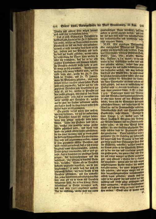 Vineta und anderer oͤrter mögen hiermit auch wohl eine verknüpfung haben. Daß es auch Schwarzen Bernftein in der Mark gebe, davon hat der Hr. D. Feldmann eine probe, welcher im Ruppiniſchen in einem Elſenbruch ein ſtuͤk von dieſer ahrt gefunden: wiewohl er nicht von natur dieſe farbe an ſich hat, ſondern weil das Elſenholz und borke die kraft hat dunkel zufaͤrben, wie wir unten bei beſchreibung der Spree ſehen werden, fü laͤſſet ſich vermuhten, daß der in der erde zwiſchen Elſenbauͤmen und ſtaͤmmen befindliche Bernſtein ebenfalls ſolche farbe in groſſer menge an ſich genommen. Welche muhtmaſſung nicht wenig beſtaͤrket wird, weil die ſtuͤkke dieſer ahrt, welche der si D. Gleditſch bei Droſſen, und Hr. D. Zimmermann bei Wittenberg gefunden, eben einen ſolchen locum natalem gehabt haben. Sonſt wird noch angemerket, daß der aus der erde gegrabene Bernſtein zum verarbeiten ſo gut nicht iſt, als der, welcher in Preuſſen auf dem waſſer gefangen, oder ſonſt an den ſtrand getrieben wird: es ſei, daß es eine andere von natur parſche ahrt Bernſtein it, welches auf die ahrt der Bauͤme ankommen wurde, oder daß er durch die laͤnge derzeit in der Erde ſolches weſen an ſich genommen. Ein gewiſſer borfall würde hier noch einen platz herdienen, der ſich bei aufwerfung des Plauiſchen kanals ſoll erauͤget haben: