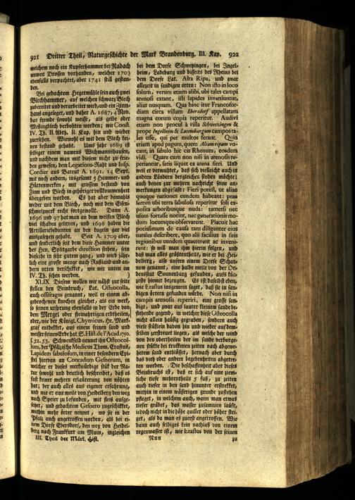 Zinn und Blech in gehoͤriger vollkommenheit übergeben worden. Es hat aber damahls weder mit dem Blech, noch mit dem Eiſenſchmelzwerk recht fortgewollt. Dann A. 1696 und 97 hat man an dem weiſſen Blech viel ſchaden gelitten, und 1698 haben die Artilleriebedienten an den kugeln gar viel auszuſetzen gehabt. Seit A. 1709 aber, und ſonderlich ſeit dem dieſe Hammer unter des Hrn. Splitgarbe direction ſtehen, fein dieſelbe in ſehr gutem gang, und wird jaͤhrlich eine groſſe menge nach Rußland und andern orten verſchikket, wie wir unten im IV. Th. ſehen werden. J XI IX. Dieſem wollen wir naͤhſt zur ſeite ſtellen den Beinbruch, Lat. Oſteocolla, auch oſſifragus genannt, weil er einem abgebrochenen knochen gleichet, als ein werk, ſo ſeinen urſprung ebenfalls in der Erde von dem Mergel oder ſteinahrtigen erdtheilen, oder, wie der Koͤnigl. Chymicus, Hr. Marks graf entdekket, aus einem feinen ſand und weiſſer feinen Erde hat. S. Hiſt. de l' Acad. o. ſ. 52. 53. Schwenkfeld nennet ihn Oſteocollum, der Pfaͤljiſche Medicus Thom. Eraſtus, Lapidem ſabuloſum, in einer beſondern Epiſtel hiervon. an Conradum Geſnerum, in welcher er dieſes merkwürdige ſtuͤk der Natur ſowohl und deutlich beſchreibet, daß es faſt keiner mehren erlauͤterung von noͤhten hat; der auch alles aus eigener erfahrung, und wie er eine meile von Heidelberg den weg nach Speier zu befunden, mit fleiß aufgeſetzt, und gedachtem Geſnero zugeſchikket, mithin mehr oͤrter nennet, wo fie in der Pfalz auch angetroffen worden, als bei et: nem Dorfe Ebersdorf, den weg bon HeidelBerg nach Frankfurt am Main, ingleichen Ill. Theil der Maͤrk. Hiſt.
