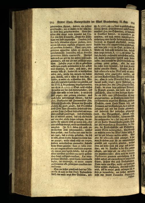 Koͤnigl. Preuß. Geheimenrahts und Staatzminiſters Hrn. bon Schmettau, ſo damahl in Frankfurt ſtudiret, in augenſchein genommen, und nach meiner damahligen be urtheilung einen bericht davon an die Konig. Societaͤt in England abgeſtattet, welchen dieſelbe dero aclis einzuverleiben gewürdiget, und beim jahr 1668 im Sept. zu finden it, Wobei ich doch nicht verhalten kan, daß als man lange hernach A. 1719, im monat Ju. lius, die ſache nochmahls unterſuchen wollen, ſich nichts ſonderliches daſelbſt mehr finden laſſen: weil hieleicht die Graͤber der ſache eine zeitlang zuviel gethan, oder der wind die rechte oͤrter verwehet, daß man ſie nicht wieder antreffen koͤnnen. Sonſten aber iſt dieſe oſteocolla in der Mark noch an unterſchiedenen orten angetroffen worden, als