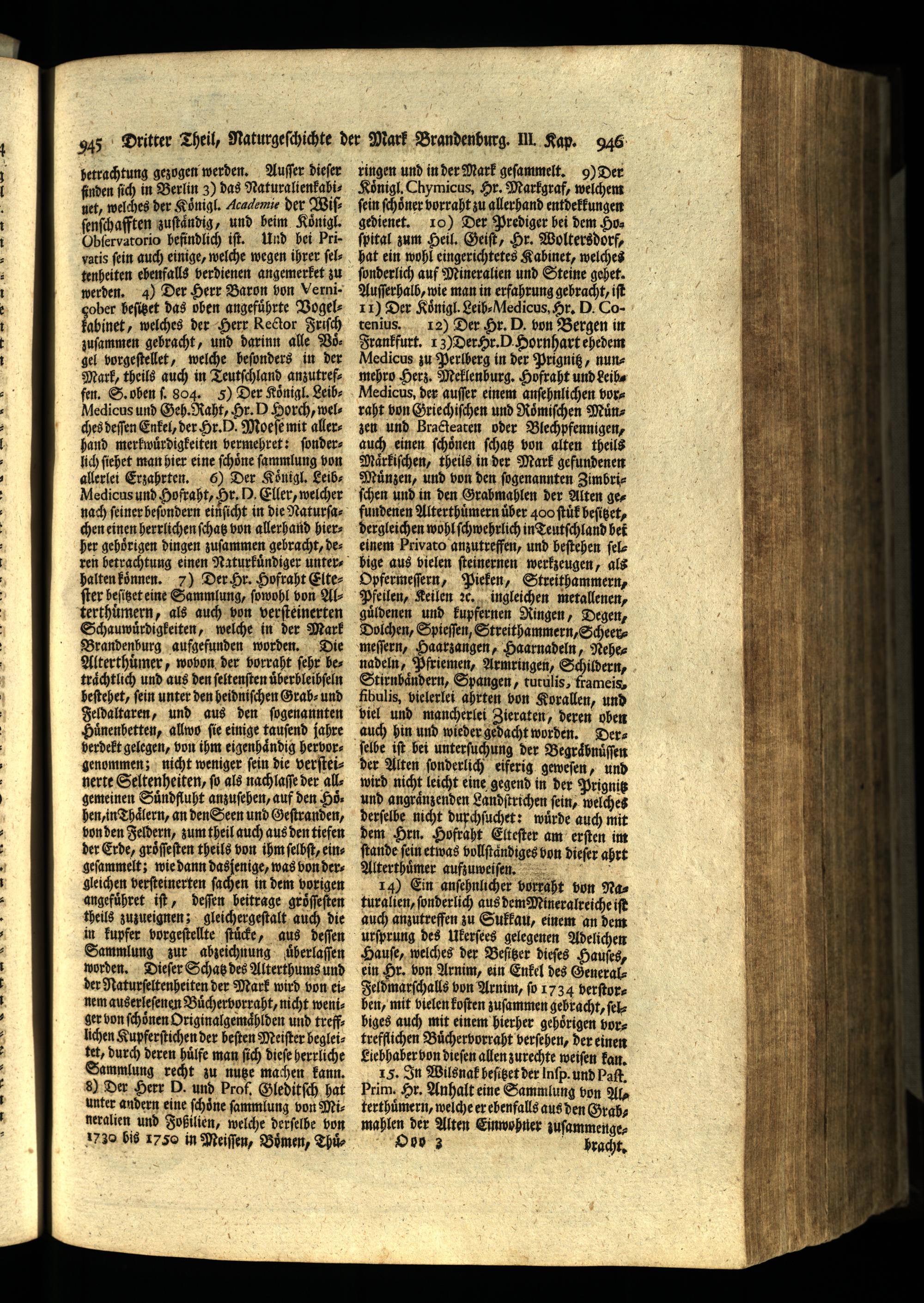 ringen und in der Mark geſammelt. 9) Der Koͤnigl. Chymicus, Hr. Markgraf, welchem fein ſchoͤner vorraht zu allerhand ent dekkungen gedienet. 10) Der Prediger bei dem Hoſpital zum Heil. Geiſt, Hr. Woltersdorf, hat ein wohl eingerichtetes Kabinet, welches ſonderlich auf Mineralien und Steine gehet. Auſſerhalb, wie man in erfahrung gebracht, iſt 11) Der Koͤnigl. Leib⸗ Medicus, Hr. D. Cotenius. 12) Der Hr. D. von Bergen in Frankfurt. 13) Der Hr. D Hornhart ehedem Medicus zu Perlberg in der Prignitz, nunmehro Herz. Meklenburg. Hofraht und Leibe Medicus, der auſſer einem anſehnlichen vorraht von Griechiſchen und Roͤmiſchen Muͤnzen und Bracteaten oder Blechpfennigen, auch einen ſchoͤnen ſchatz von alten theils Maͤrkiſchen, theils in der Mark gefundenen Muͤnzen, und von den ſogenannten Zimbri