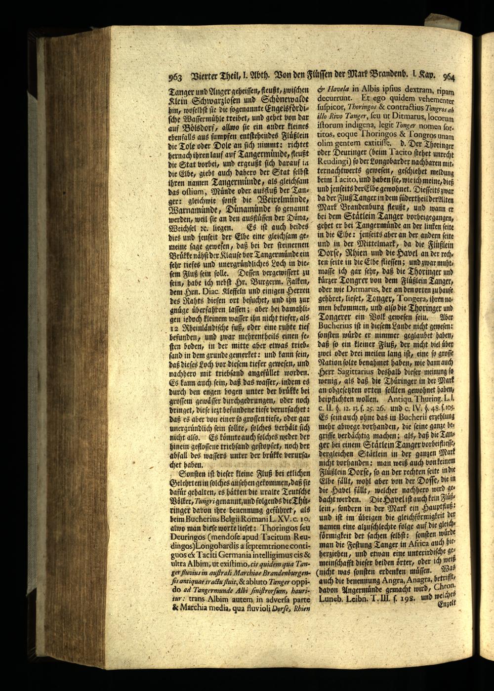 Es kann auch ſein, daß das waſſer, indem es durch den engen bogen unter der bruͤkke bei groſſem gewaͤſſer durchgedrungen, oder noch dringet, dieſe iezt befundene tiefe verurſachet: daß es aber bon einer ſo groſſen tiefe, oder gar unergruͤndlich fein ſollte, ſolches verhaͤlt ſich nicht alſo. Es koͤnnte auch ſolches weder der hinein gefloſſene triebſand geſtopfet, noch der abfall des waſſers unter der bruͤkke verurſachet haben. 21 Sonſten iſt dieſer kleine Fluß bei etlichen Gelehrtenin ſolches anſehen gekommen, daß fie dafuͤr gehalten, es haͤtten die uralte Teutſche Voller, Tungri genannt ß und folgends die Thuringer dabon ihre benennung gefuͤhret, als beim Bucherius Belgij Romani L.XV. c. 10. alwo man dieſe worte lieſet Ihoringos feu Deuringos(mendoſe apud Tacitum Reudingos) Longohardis a ſeptemtrione contiguos ex Laciti Germania intelligimus cis& ultra Albim, ut exiſtimo, cis quidem qua Tunger fuvius in außrali Marchige BrandenhurgenHa antiquae traclu ſluit& abluto Tanger oppido ad Tangermunde Albi ſiniſtrorſum, hauritur- trans Albim autem in adverſa parte & Marchia media, qua fluvioli Derfe, Rhien