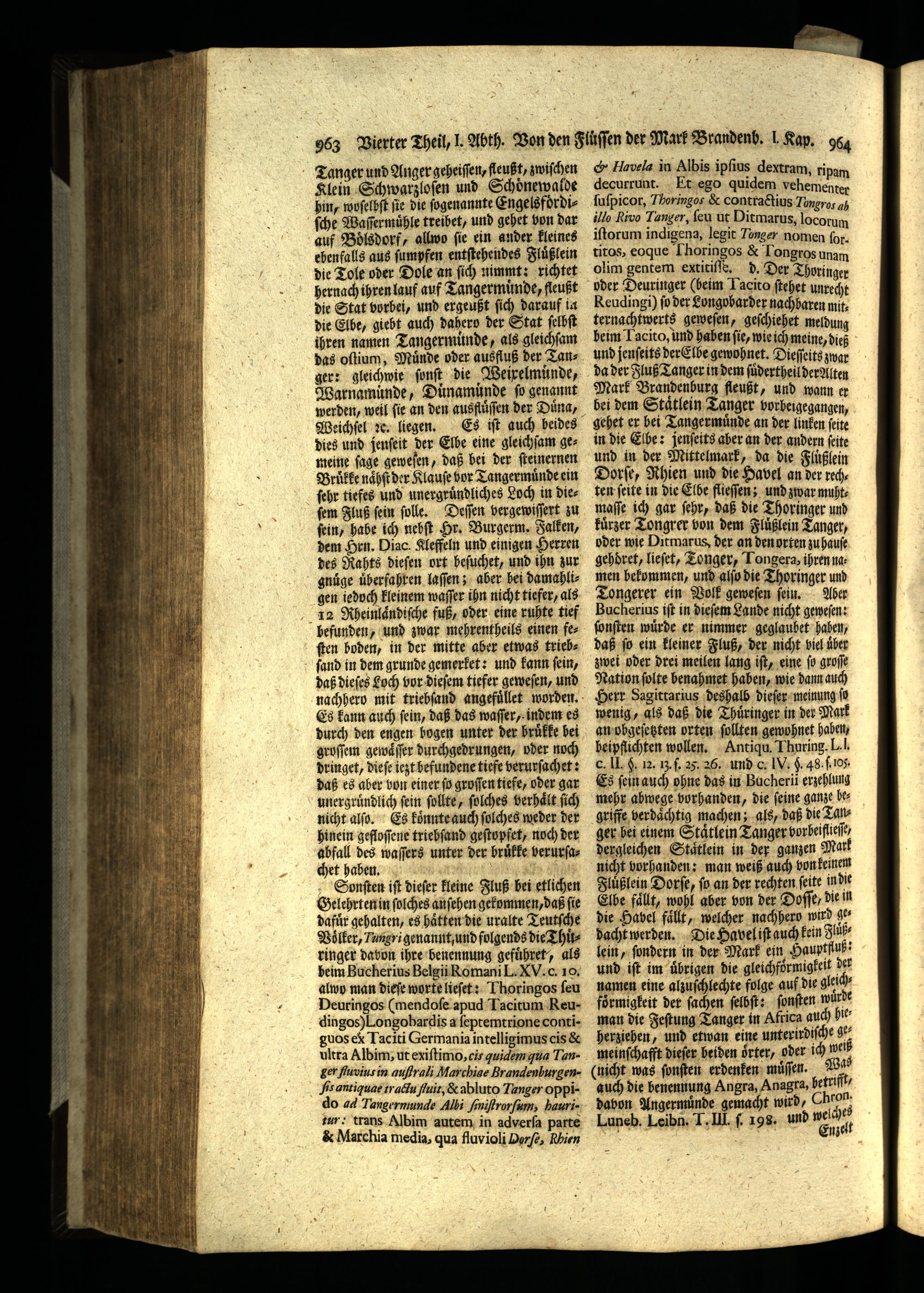 & Havela in Albis ipſius dextram, ripam decurrunt. Et ego quidem vehementer ſuſpicor, horingos& contractius Jungros g; illo Rivo Tanger, ſeu ut Ditmarus, locorum iſtorum indigena, legit Junger nomen ſor. titos, eoque LThoringos& Longros unam olim gentem extitiſſe. d. Der Thoringer oder Deuringer(beim Lacito ſtehet unrecht Reudingi) ſo der Longobarder nachbaren mit; ternachtwerts geweſen, geſchiehet meldung beim Tacito, und haben ſie, wie ich meine, dieß und jenſeits der Elbe gewohnet. Dieſſeits zwar da der Jluß Tanger in dem ſůdertheil derꝛllten Mark Brandenburg fleußt, und wann er bei dem Staͤtlein Tanger vorbeigegangen, gehet er bei Tangermünde an der linken ſeite in die Elbe: jenſeits aber an der andern ſeite und in der Mittelmark, da die Flüßlein Dorſe, Rhien und die Havel an der rech= ten ſeite in die Elbe flieſſen; und zwar muhtmaſſe ich gar ſehr, daß die Thoringer und kurzer Tongrer von dem Fluͤßlein Tanger, oder wie Ditmarus, der an den orten zu baufe gehdret, lieſet, Longer, Tongera, ihren namen bekommen, und alſo die Thoringer und Tongerer ein Volk geweſen fein. Aber