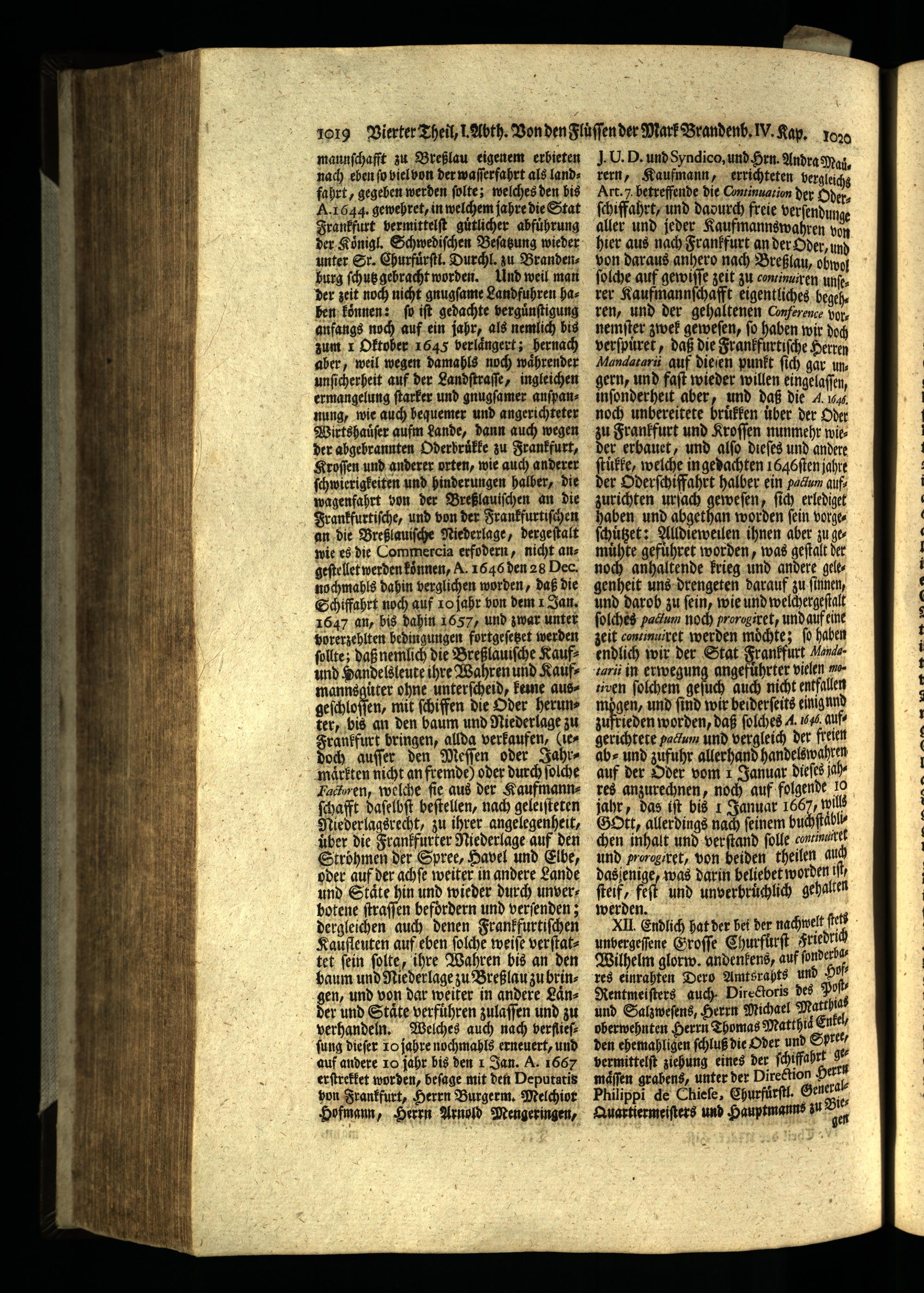 unter Sr. Churfuͤrſtl. Durchl. zu Brandenburg ſchutz gebracht worden. Und weil man der zeit noch nicht gnugſame Landfuhren has ben koͤnnen: fo iſt gedachte vergüͤnſtigung anfangs noch auf ein jahr, als nemlich bis zum ı Oktober 1645 verlängert; hernach aber, weil wegen damahls noch waͤhrender unſicherheit auf der Landſtraſſe, ingleichen ermangelung ſtarker und gnugſamer anſpannung, wie auch bequemer und angerichteter Wirtshauͤſer aufm Lande, dann auch wegen der abgebrannten Oderhruͤkke zu Frankfurt, Kroſſen und anderer orten, wie auch anderer ſchwierigkeiten und hinderungen halber, die wagenfahrt von der Breßlauiſchen an die Frankfurtiſche, und von der Frankfurtiſchen an die Breßlauiſche Niederlage, dergeſtalt wie es die Commercia erfodern, nicht angeſtellet werden konnen, A. 1646 den 28 Dec. nochmahls dahin verglichen worden, daß die Schiffahrt noch auf 10 jahr von dem 1 Jan. 1647 an, bis dahin 1657, und zwar unter vorerzehlten bedingungen fortgeſetzet werden ſollte; daß nemlich die Breßlauiſche Kaufund Handelsleute ihre Wahren und Kaufmannsgiuter ohne unterſcheid, keine qus. mit ſchiffen die Oder herunter, bis an den baum und Niederlage zu Frankfurt bringen, allda verkaufen,(iedoch auſſer den Meſſen oder Jahrmaͤrkten nicht an fremde) oder durch ſolche Fachren, welche fie aus der Kaufmannſchafft daſelbſt beſtellen, nach geleiſteten Niederlagsrecht, zu ihrer angelegenheit, über die Frankfurter Niederlage auf den Ströhmen der Spree, Havel und Elbe, oder auf der achſe weiter in andere Lande und Staͤte hin und wieder durch unverbotene ſtraſſen befoͤrdern und verſenden; dergleichen auch denen Frankfurtiſchen Kaufleuten auf eben ſolche weiſe verſtattet fein ſolte, ihre Wahren bis an den baum und Niederlage zu Breßlau zu bringen, und von dar weiter in andere Laͤnder und Staͤte verfuͤhren zulaſſen und zu verhandeln. Welches auch nach verflieſſung dieſer 10 jahre nochmahls erneuert, und auf andere 10 jahr bis den 1 Jan. A. 1667 erſtrekket worden, beſage mit den Deputatis von Frankfurt, Herrn Burgerm. Melchior Hofmann, Herrn Arnold Mengeringen,