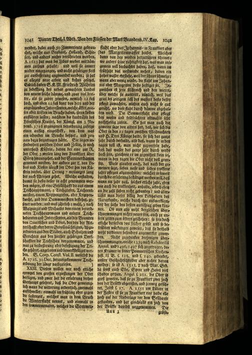 XXIII. Dieſem wollen wir noch etliche exempel von groſſen ergieſſungen der Oder beifügen, und zwar hat die erfahrung bisher überhaupt gelehret, daß die Oder gemeiniglich wann die witterung ordentlich, zweimahl aufſchwellet: einmahl im fruͤhling oder gegen