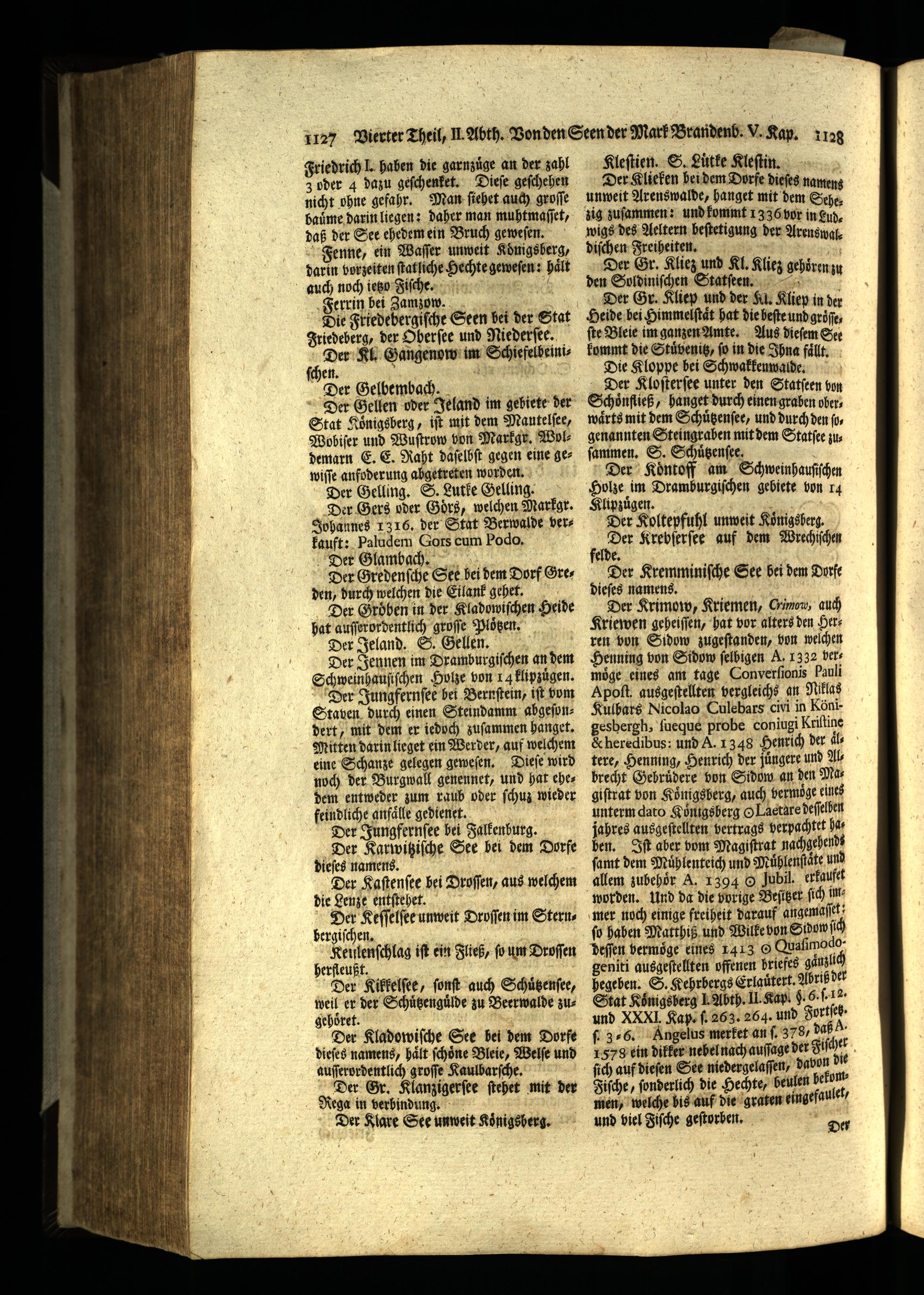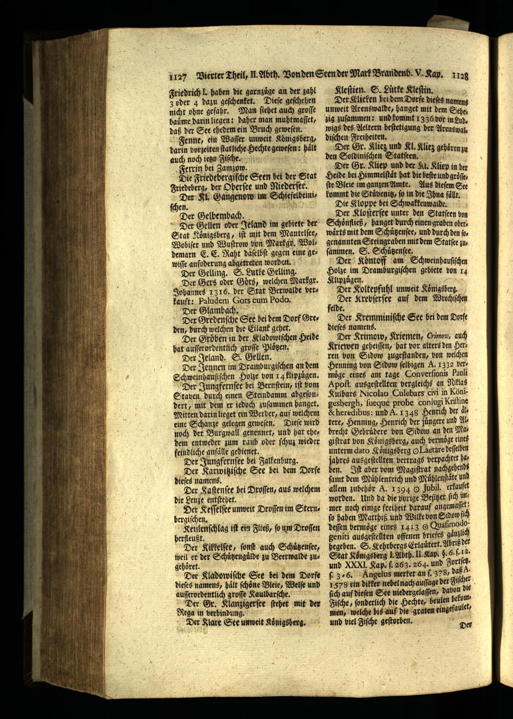 Friedrich l. haben die garnzuͤge an der zahl 3 oder 4 dazu geſchenket. Dieſe geſchehen nicht ohne gefahr. Man ſiehet auch groſſe hauͤme darin liegen: daher man muhtmaſſet, daß der See ehedem ein Bruch geweſen. SFenne, ein Waſſer unweit Kdͤnigsberg, darin vorzeiten ſtatliche Hechte geweſen: haͤlt auch noch ietzo Fiſche. Und Ferrin bei Zamzow. Die Friedebergiſche Seen bei der Stat Friedeberg, der Oberſee und Niederſee. Der Kl Gangenom im Schiefelheini