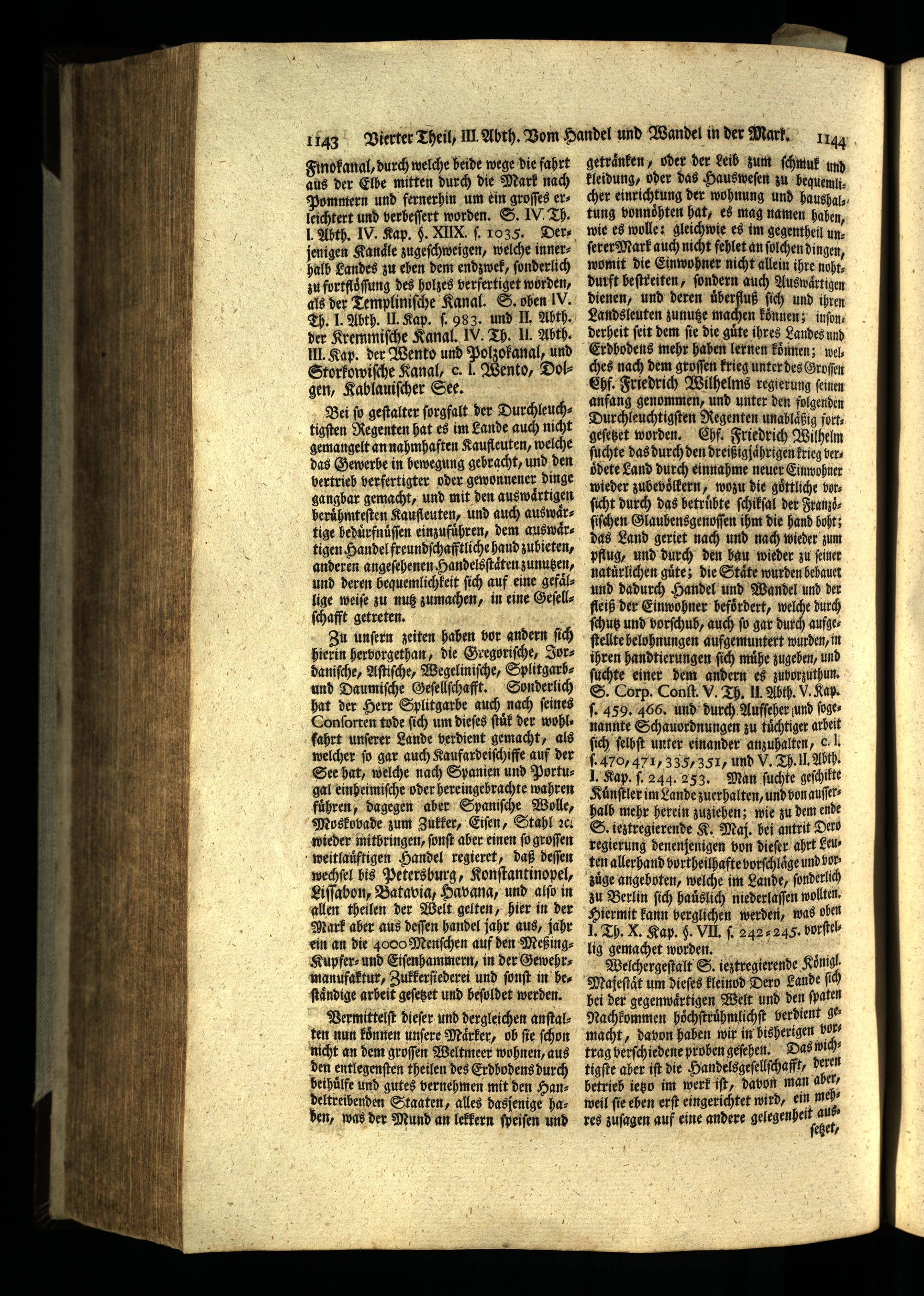 getraͤnken, oder der Leib zum ſchmuk und kleidung, oder das Hausweſen ö cher einrichtung der wohnung und hauthal, tung vonnoͤhten hat, es mag namen haben, wie es wolle: gleichwie es im gegentheil un ſerer Mark auch nicht fehlet an ſolchen dingen womit die Einwohner nicht allein ihre noht durft beſtreiten, ſondern auch Auswärtigen dienen, und deren uͤberfluß ſich und ihren Landsleuten zunutze machen koͤnnen; inſonderheit ſeit dem fie die guͤte ihres Landes und Erdbodens mehr haben lernen konnen; welches nach dem groſſen krieg unter des Groſſen Chf. Friedrich Wilhelms regierung ſeinen anfang genommen, und unter den folgenden Durchleuchtigſten Regenten unablaͤßig fortgeſetzet worden. Chf. Friedrich Wilhelm ſuchte das durch den Dreißigjährigen krieg vers oͤdete Land durch einnahme neuer Einwohner wieder zubevoͤlkern, wozu die göttliche borſicht durch das betrübte ſchikſal der Franzi ſiſchen Glaubensgenoſſen ihm die hand boht; das Land geriet nach und nach wieder zum pflug, und durch den bau wieder zu ſeiner natürlichen guͤte; die Staͤte wurden behauet und dadurch Handel und Wandel und der fleiß der Einwohner befördert, welche durch ſchutz und vorſchub, auch ſo gar durch aufgeſtellte belohnungen aufgemuntert wurden, in ihren handtierungen ſich muͤhe zugehen, und ſuchte einer dem andern es zuvorzuthun. S. Corp. Conſt. V. Th. Il. Abth. V. Kap. ſ. 459. 466. und durch Auſſeher und ſogenannte Schauordnungen zu tuͤchtiger arbeit ſich ſelbſt unter einander anzuhalten, C. ſ. Mo, 471, 335,351, und V. Th. Il. Abth. 1. Kap. ſ. 244. 253. Man ſuchte geſchilte Kuͤnſtler im Lande zuerhalten, und von auſſerhalb mehr herein zliziehen; wie zu dem ende S. ieztregierende K. Maj. bei antrit Dero regierung denenjenigen bon dieſer ahrt Leuten allerhand vortheilhafte vorſchlaͤge und bor zuͤge angeboten, welche im Lande, ſonderlich zu Berlin ſich hauslich niederlaſſen woltten. Hiermit kann verglichen werden, was oben jI. Th. X. Kap. 5. Vll.. 242.245. porſteſlig gemachet worden. Welchergeſtalt S. iejtreglerende König Mafeſt ãt um dieſts kleinod Dero Lande ſih hei der gegenwärtigen Welt und den ſpaten Nachkommen höͤchſtruͤhmlichſt verdient ge macht, davon haben wir in bisherigen bor— trag berſchiedene proben geſehen. Das ich tigſte aher iſt hie Handels geſellſchafft, deren betrieb iego im werk iſt, dabon man aben, weil fie eben erſt eingerichtet wird, ein mehres zuſagen auf eine andere gelegenbeit n,
