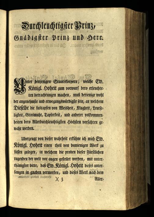 Uberzeugt von diefer wahrheit erkuͤhne ich mich Ew. Koͤnigl. Hoheit einen theil von demienigen Werk zu fuͤſſen zulegen, in welchem die proben diefer Fuͤrſtlichen tugenden der welt vor augen geſtellet werden, mit unter thaͤnigſter bitte, daß Ew. Königl. Hoheit dieſes unter a in i Innen vermerken, und dieſes Werl nach ö.