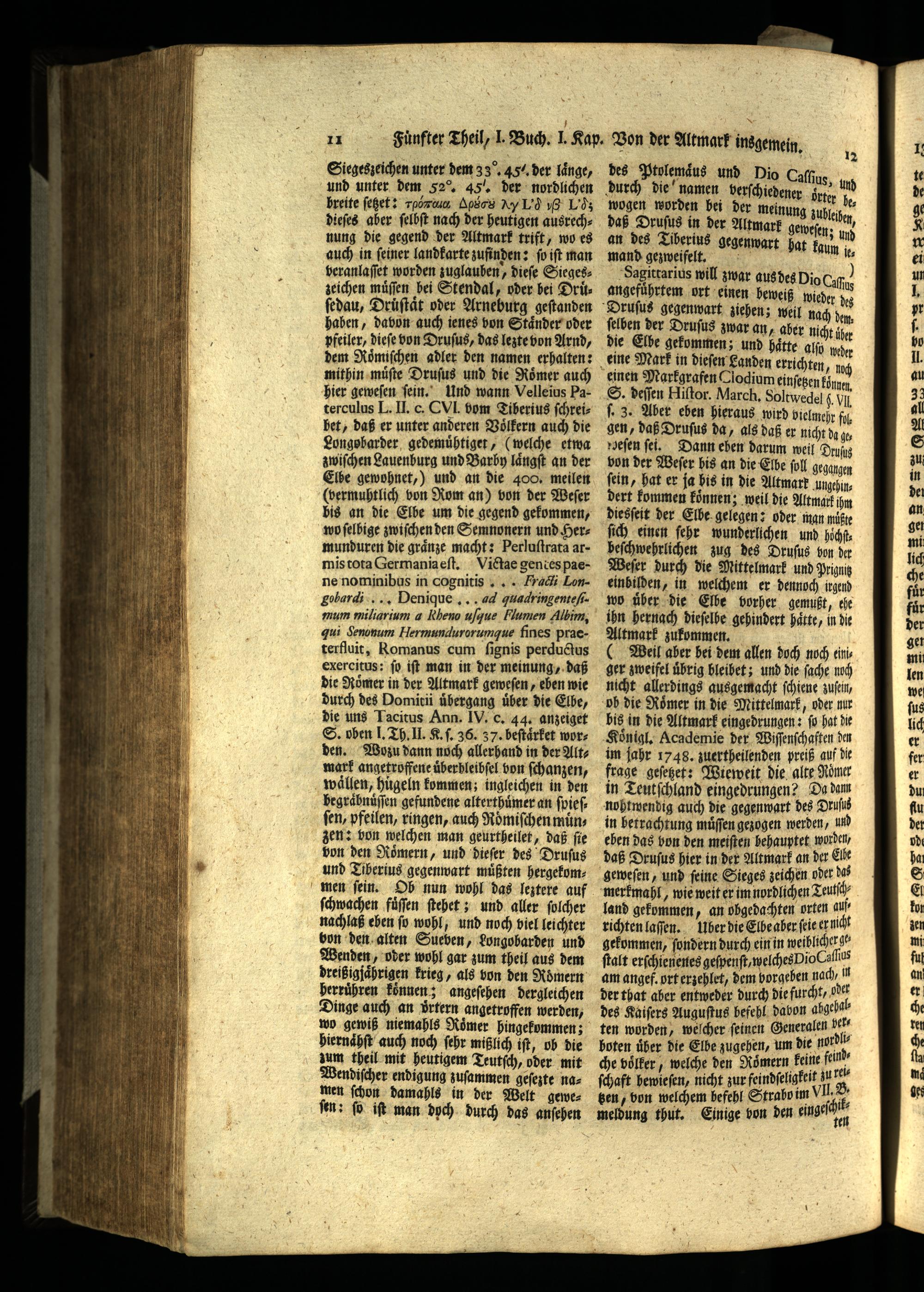 Weil aber bei dem allen doch noch einiger zweifel übrig bleibet; und die ſache noh nicht allerdings ausgemacht ſchiene zuſemn, oh die Römer in die Mittelmark, oder mr bis in die Altmark eingedrungen: ſo hat di Koͤnigl. Academie der Wiſſenſchaſten den im jahr 1748. zuertheilenden preiß auf die frage geſetzet Wieweit die alte Römer in Teutſchland eingedrungen? Da dam nohtwendig auch die gegenwart des Druſtz in betrachtung muſſen gezogen werden, und eben das bon den meiſten behauptet. worden daß Druſus hier in der Altmark an der Elhe geweſen, und feine Sieges zeichen oder dus merkmahl, wie weit er im nordlichen Teutſhland gekommen, an obgedachten orten auf richten laſſen. uber bie Elbe aber ſeie er nid} gekommen, ſndern durch ein in weiblicher 9 ſtalt erſchienenes geſpenſt, welches Pio Calli am angef. ort erzehlet, dem borgeben. der that aber entweder durch die furcht, ode des Kaiſers Auguſtus befehl davon nagen, ten worden, weſcher ſeinen Generalen we% boten über die Elbe zugehen, um die. che vöͤlker, welche den Römern keine up ſchaft bewiefen, nicht zur feindſeligkeit 1 ten, von welchem befehl Strabo im V ht, meldung thut. Einige von den eingel ten