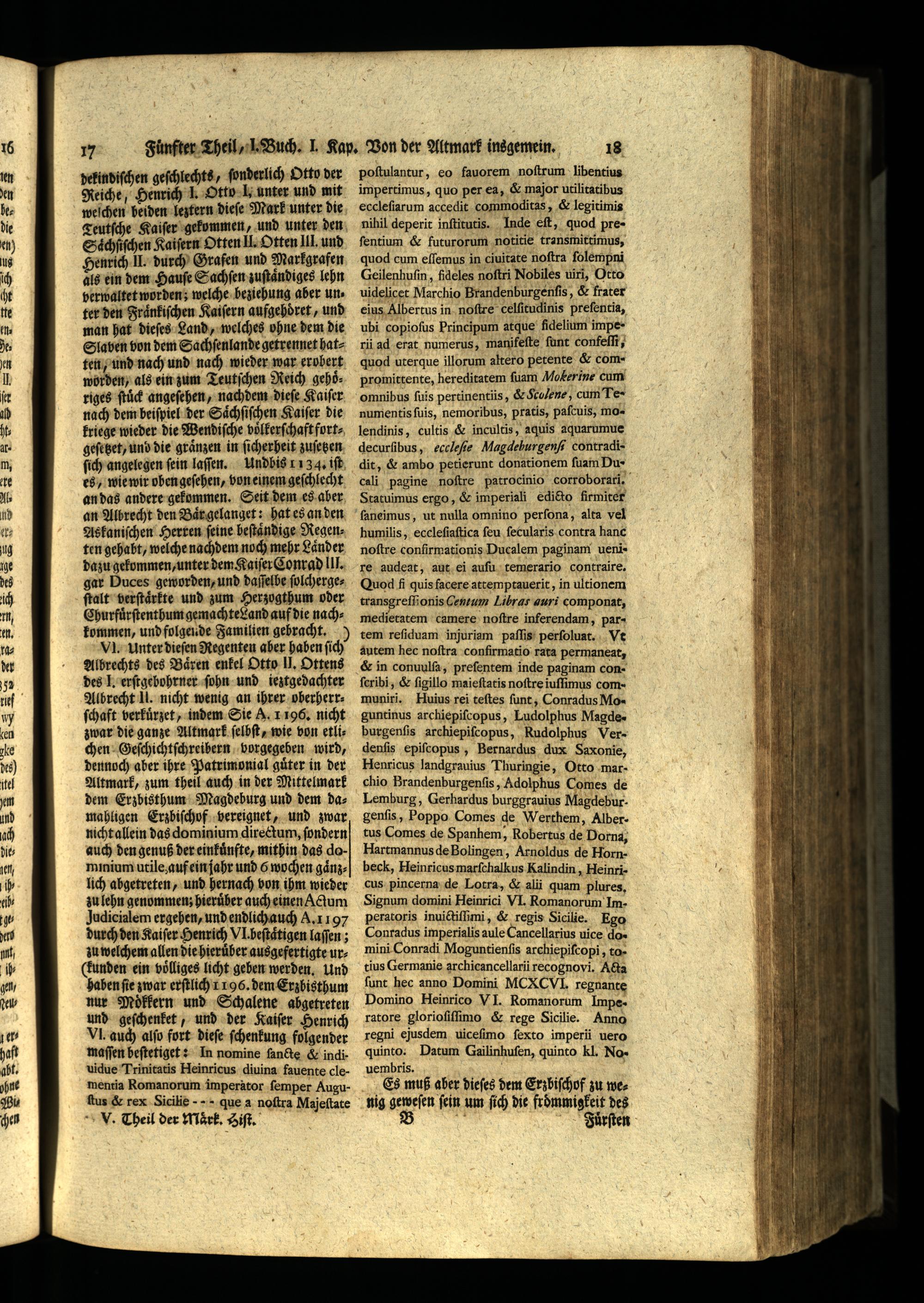 delindiſchen geſchlechts, ſonderlich Otto der Reiche, Henrich J. Otto 1, unter und mit weichen beiden leztern dieſe Mark unter die Teutſche Kaiſer gekommen, und unter den Saͤchſiſchen Kaiſern Otten II. Otten Ill. und Henrich il. durch Grafen und Markgrafen als ein dem Hauſe Sachſen zuſtaͤndiges lehn verwaltet worden; welche beziehung aber unter den Fraͤnkiſchen Kaiſern aufgehdret, und man hat dieſes Land, welches ohne dem die Slaven von dem Sachſenlande getrennet hatten, und nach und nach wieder war erobert worden, als ein zum Teutſchen Reich gehoͤriges ſtuͤck angeſehen, nachdem dieſe Kaiſer nach dem beiſpiel der Saͤchſiſchen Kaiſer die kriege wieder die Wendiſche voͤlkerſchaft fortgeſetzet, und die graͤnzen in ſicherheit zuſetzen ſich angelegen ſein laſen. Undbis 1134. iſt es, wie wir oben geſehen, von einem geſchlecht an das andere gekommen. Seit dem es aber an Albrecht den Baͤr gelanget: hat es an den Askaniſchen Herren feine beſtaͤndige Regen: ten gehabt, welche nachdem noch mehr Laͤnder dazu gekommen, unter dem Kaniſer Conrad lll. gar Duces geworden, und daſſelbe ſolchergeſtalt verſtaͤrkte und zum Herzogthum oder Churfuͤrſtenthum gemachte Land auf die nachkommen, und folgende Familien gebracht. VI. Unter dieſen Regenten aber haben ſich Albrechts des Baͤren enkel Otto II. Ottens des L erſtgebohrner ſohn und ieztgedachter Albrecht II. nicht wenig an ihrer oberherrſchaft verkuͤrzet, indem Sie. 1196. nicht zwar die ganze Altmark ſelbſt, wie von etlichen Geſchichtſchreibern vorgegeben wird, dennoch aber ihre Patrimonial guͤter in der Altmark, zum theil auch in der Mittelmark dem Erzbisthum Magdeburg und dem damahligen Erzbiſchof vereignet, und zwar nicht allein das dominium directum, ſondern auch den genuß der einkuͤnfte, mithin das dommium utile, auf ein jahr und 6 wochen gaͤnzlich abgetreten, und hernach von ihm wieder zu lehn genommen; hierüber auch einen Actum Judicialem ergehen, und endlich auch A. 1197 durch den Kaiſer Henrich VI. beſtaͤtigen laſſen; zu welchem allen die hieruͤber ausgefertigte ur(unden ein voͤlliges licht geben werden. Und haben ſie zwar erſtlich 1196. dem Erzbisthum nur Moͤkkern und Schalene abgetreten und geſchenket, und der Kaiſer Henrich Vl. auch alſo fort dieſe ſchenkung folgender maſſen beſtetiget: In nomine ſancte& indiuidue Trinitatis Heinricus diuina fauente clemenrtia Romanorum imperator ſemper Auguſtus& rex Sicilie-- que a noſtra Majeſtate V. Theil der Maͤrk. Hiſt.
