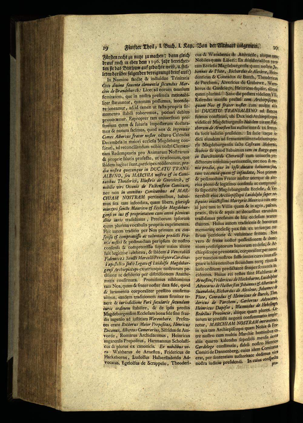 drauf noch in ehen dem 1196, jahr bereicherten fie das Blsthum auf gedachte weife, u. ſtel leten darüber folgenden dereignungs brief aus:) In Nomine fancte& indiuidue Trinitatis Otto diuina fauente clemenria ſecundus Marchio de Brandeburch. Licet ad eorum omnium fir mitatem, que in noſtra preſentia ratio nab iter ſtatuuntat, quantum poſſumus, intendere teneamut, ad id tamen ut facta propria firmamento ſtabiſi roboremus, potiori debito prouocamur. Hapropter tam uniuerſitati preſentium quam& futuris impoſtetum declaramus& notum facimus, quod nos& ingenunr Comes Albertus frarer noſter octavo Calendas Decembris in maiori eccleſia Magdeburg conNituti, ad reconciliandum nobis noſtri Clementiam RKedemptoris pro Animarum Noftrarum & proprie falutis profe&u, ut Srationum, que ibidem iugiter funt, patticipes redderemur, pre dia noſtra quetunque in DUCATU TRA MS. ALBINO, feu MARCHIA naſtra&, in Comizatibus Theoderick, Illuſtris de Gnowitzb, e „obilis viri Ortonis de Falkenfein Comirum, nec non in omnibus Comiratibus ad MARCHIAM MosSTRAM pertinentibus, habuimus ſita tam infeodata, quam libera, glorioſ martyri ſancio Mauritio& Fecleſie Magdeburgenfi in ius& proprietatem cum omni plenituAin, iaris tradidimus, Prediorum ipſorum quam plurima vocahulis propriis exprimentes. Hec autem traditio per Nos primum ex conſenſu& compromiſſs ac voluntute predicli Framrs noſt/ i& poftmodum per ipfum de noſtro Confenfü& compromiſſo ſuper maius altare fut legitime celebrata,& ibidem@ Venerahili Hidentio z.. undi Marcelli bhrechyteroαrdind‘3 apoßolico ſed i Legato Luidolfo Magdeburgen. Archiepistopo ex utriusque noſtrorum petitione ac deſiderio per diſtrittionem Anathematis confſirmata. Promiſimus nihilominus tam Nos, quam& frater noſter data fide, quod & iuramento corporaliter preſtito confirmauimus, eandem traditionem ratam firmiter tenere& iurirdiclione Fori ſecularis ſecundum juris ordinem ſtabilire,& de ipſis predüs Magdeburgenſem Eceleſiam bona fide fine fraudis ingenio ad juſtitiam Warenthare. Preſentes erant Rockerus Maior Prepoſitus, Henricus Decanus, Albertus Camerarius, Sifridus de Amvorde, Romarus Archidiaconus, Heinricus angarenſis Prepoſitus, Hartmannus Scholaſticus& plures ex canonicis. Ex nobilibus vero Waltherus de Arneſten, Fridericus de ,,, Hlalberſtadenſis Ad atus, Egelolfus de Sctappelo, Theoderi