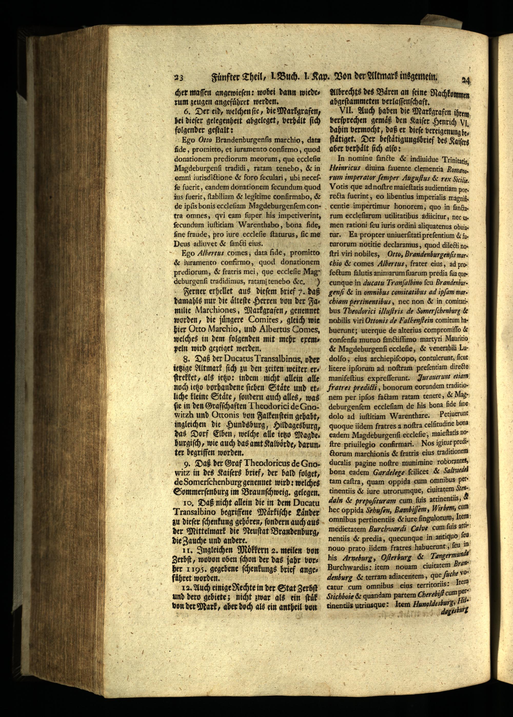 deburgenſi tradidimus, ratam tenebo&c. Ferner erhellet aus dieſem brief 7. daß damahls nur die aͤlteſte Herren von der Familie Marchiones, Markgrafen, genennet worden, die juͤngere Comites, gleich wie hier Otto Marchio, und Albertus Comes, welches in dem folgenden mit mehr exempeln wird gezeiget werden., 8. Daß der Ducatus Transalbinus, oder ietzige Altmark ſich zu den zeiten weiter erſtrekket, als ietzo: indem nicht allein alle noch ietzo vorhandene ſieben Staͤte und etliche kleine Staͤte, ſondern auch alles, was fie in den Grafſchaften Theodorici de Gnowitah und Ottonis von Falkenſtein gehabt, ingleichen die Hundsburg, Hildagesburg, das Dorf Elben, welche alle ietzs Magdeburgiſch, wie auch das amt Kalvoͤrde, darunter begriffen worden.;. 9. Daß der Graf Theodloricus de Gnowitz in des Kaiſers brief, der hald folget, de Somerſchenburg genennet wird: welches Sommerſenburg im Braunſchweig. gelegen. 10. Daß nicht allein die in dem Ducatu Transalbino begriffene Maͤrkiſche Länder zu dieſer ſchenkung gehoͤren, ſondern auch aus der Mittelmark die Neuſtat Brandenburg, die Zauche und andere.|