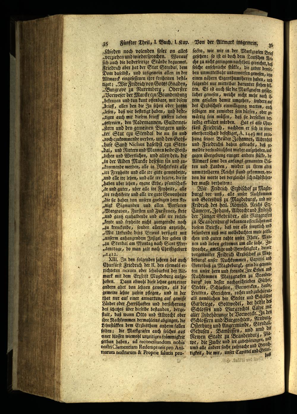 Churfuͤrſt Friedrich der II. den ehemals erxichteten nexum oder lehnbarkeit der Altmark mit dem Erzſtift Magdeburg aufgehoben. Dann ohwohl dieſe lehne ganz einer andern ahrt von lehnen geweſen, als die gemeine lehne zuſein pflegen, und in der that nur auf einer anwartung auf gewiſſe Länder oder Herrſchaften und verſicherung