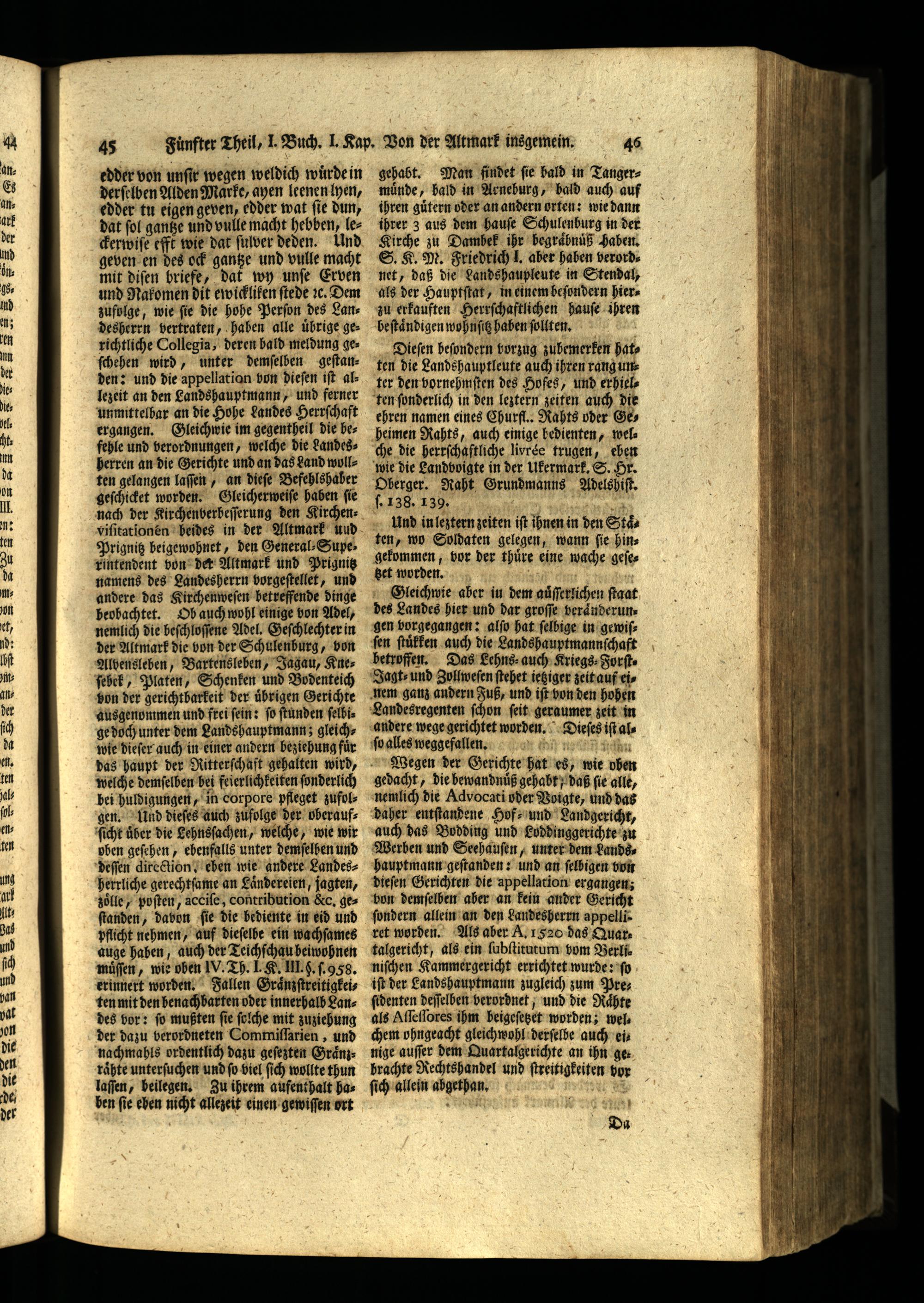 Dieſes iſt alſo alles weggefallen. X chi nern n n n Wegen der Gerichte hat es, wie oben gedacht, die bewandnuͤß gehabt/ daß fie alle, nemlich die Advocati oder Voigte, und das daher entſtandene Hof⸗ und Landgericht, auch das Bodding und Loddinggerichte zu Werben und Seehauſen, unter dem Lands. hauptmann geſtanden: und an ſelbigen von dieſen Gerichten die appellation ergangen; von demſelben aber an kein ander Gericht ſondern allein an den Landesherrn appelliret worden. Als aber A. 1520 das Quartalgericht, als ein ſubſtitutum vom Berli. niſchen Kammergericht errichtet wurde: ſo iſt der Eandshauptmann zugleich zum Preſidenten deſſelben verordnet, und die Raͤhte als Aſſeſſores ihm beigeſetzet worden; wel chem ohngeacht gleichwohl derſelbe auch eis nige auſſer dem Quartalgerichte an ihn gebrachte Rechtshandel und ſtreitigkeiten hor ſich allein abgethan. u