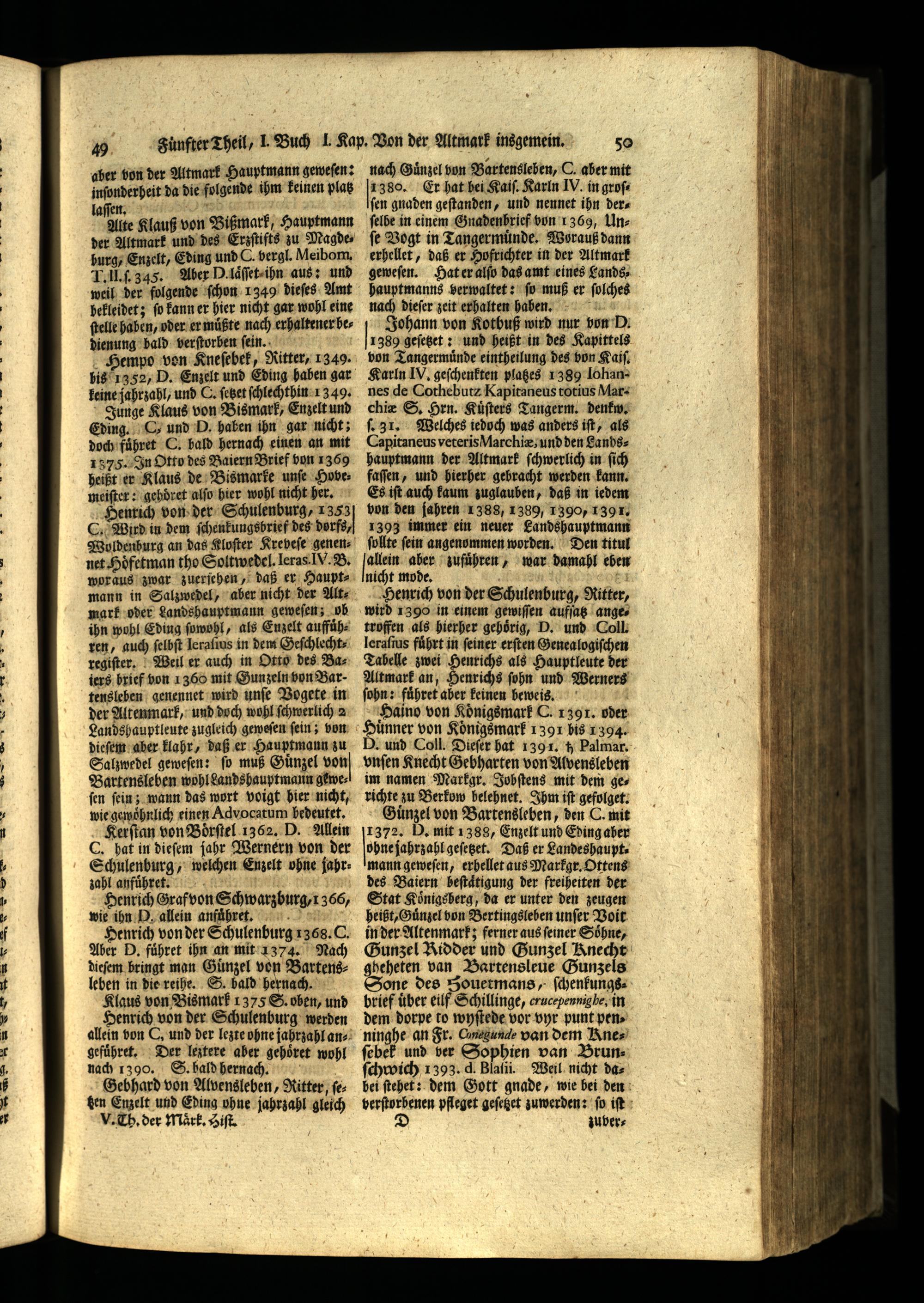leine jahrzahl, und C. ſetzet ſchlechthin 1349. Junge Klaus von Bismark, Enzelt und Eding. C. und D. haben ihn gar nicht; doch fuͤhret C. bald hernach einen an mit 1375. In Otto des Baiern Brief von 1369 heißt er Klaus de Bismarke unſe Hove meiſter: gehdret alſo hier wohl nicht her. Henrich von der Schulenburg, 1353 C. Wird in dem ſchenkungsbrief des dorfs, Woldenburg an das Kloſter Kreveſe genennet Hoͤfetman tho Soltwedel. Ieras IV. B. woraus zwar zuerjehen, daß er Hauptmann in Salzwedel, aber nicht der Altmark oder Landshauptmann geweſen; ob ihn wohl Eding ſowohl, als Enzelt auffuͤh= ren, auch ſelbſt leraſius in dem Geſchlechtregiſter. Weil er auch in Otto des Baiers brief von 1 360 mit Gunzeln von Bartensleben genennet wird unſe Vogete in der Altenmark, und doch wohl ſchwerlich a Landshauptleute zugleich geweſen ſein; von dieſem aber klahr, daß er Hauptmann zu Salzwedel geweſen: ſo muß Guͤnzel von Bartensleben wohl Landshauptmann gewes ſen ſein; wann das wort voigt hier nicht, wie gewohnlich einen Advocatum bedeutet. Kerſtan von Boͤrſtel 1362. D. Allein C. hat in dieſem jahr Wernern von der Schulenburg, welchen Enzelt ohne jahr: zahl anfuuͤhret. Henrich Graf von Schwarzburg, 1366, wie ihn D allein anfuͤhret. 2 Henrich von der Schulenburg 1368. C. Aber D. fuͤhret ihn an mit 1373. Nach dieſem bringt man Günzel von Bartensleben in die reihe. S. bald hernach. Klaus von Bismark 1375 S. oben, und Henrich von der Schulenburg werden