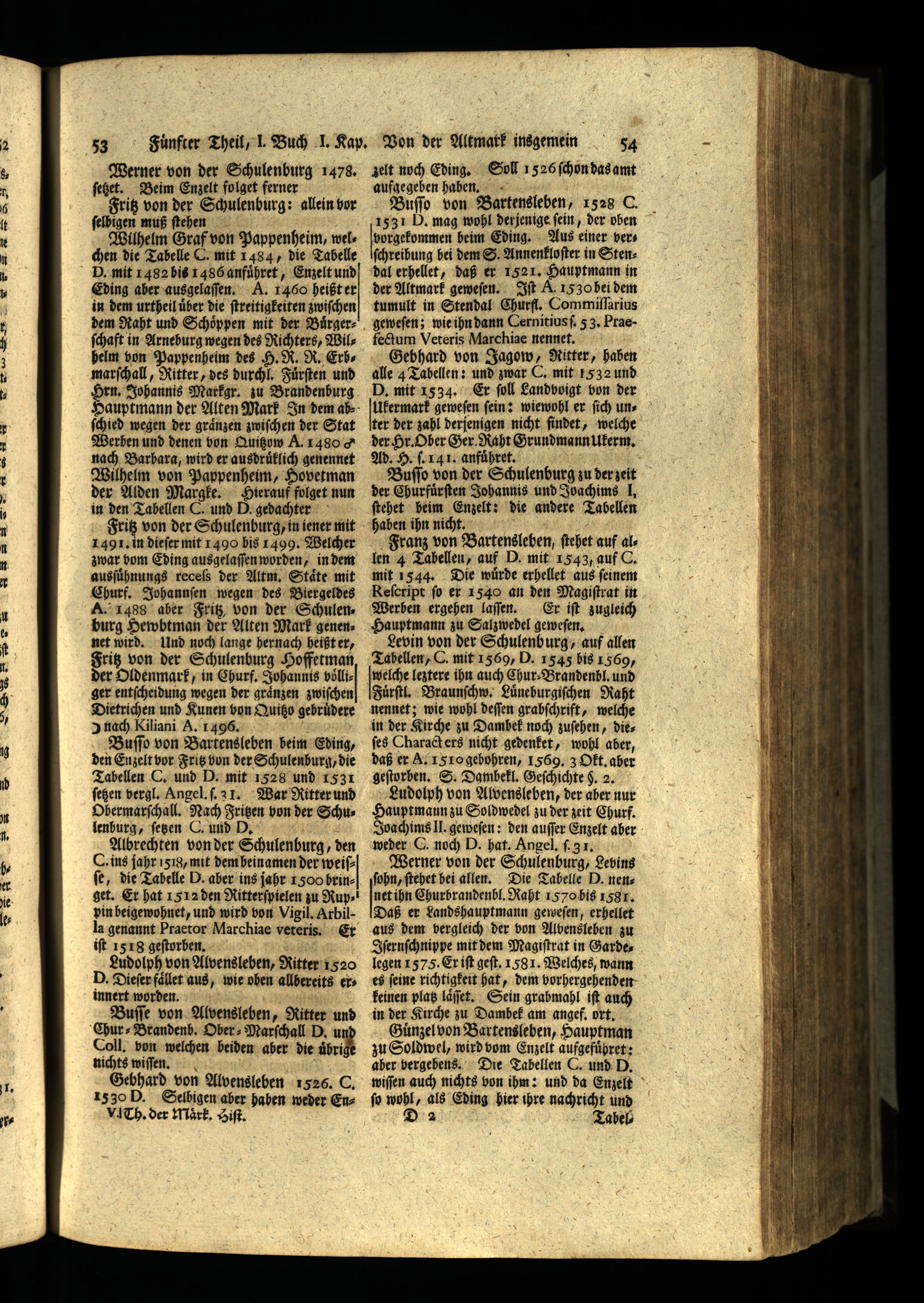 Fritz von der Schulenburg, in iener mit 1491. in dieſer mit 1490 bis 1499. Welcher zwar vom Eding ausgelaſſen worden, in dem ausſuͤhnungs receſs der Altm. Staͤte mit Churf. Johannſen wegen des Biergeldes A. 1488 aber Fritz von der Schulenburg Hewbtman der Alten Mark genennet wird. Und noch lange hernach heißt er, Fritz von der Schulenburg Hoffetman der Oldenmark, in Churf. Johannis voͤlliger entſcheidung wegen der graͤnzen zwiſchen Dietrichen und Kunen von Quitzo gebruͤdere 5 nach Kiliani A. 1496.