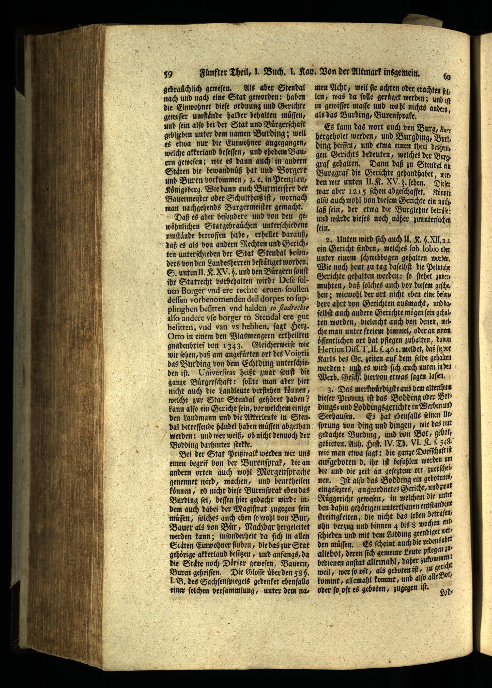 Daß es aber beſondere und von den gewohnlichen Statgebrauͤchen unterſchiedene umſtaͤnde betroffen habe, erhellet darauß, daß es als von andern Rechten und Gerichten unterſchieden der Stat Stendal beſonders von den Landesherren beſtaͤtiget worden. S. unten Il. K. XV. J. und den Bürgern ſonſt ihr Statrecht vorbehalten wird: Deſe ful