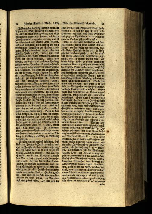 Ohne zweifel haben die Fuͤrſten und Landesherren vor zeiten dieſes gericht ſelbſt gehalten: welches daher zuwermuhten, weil alle uͤbrige Gerichte in der zeit, da dieſes gehalten worden, geruhet, und die ſtrafund andere gefaͤlle dem Landesherrn zugefallen, wohl zu keinem andern ende, als damit ſelbiger ſolche zu ſeinem aufenthalt anwenden koͤnnte: gleich wie ehedem ſelbſt die Teutſche Kaiſer an den orten, wo fie(ich ebenfalls der Gerichte halber aufgehalten, gewiſſe einkuͤnfte einzuheben gehabt, davon ſie ihre hofſtat unterhalten koͤnnen; wie an dem Burggrafthum Nuͤrnberg und einigen freien Reichsſtaͤten zuerſehen. Welche einkuͤnfte aber geblieben, auch wann ſie an ihre ſtelle ihre Burggrafen und Voigte geſchikket, die ſolche Gerichte halten muͤſſen. Unſere