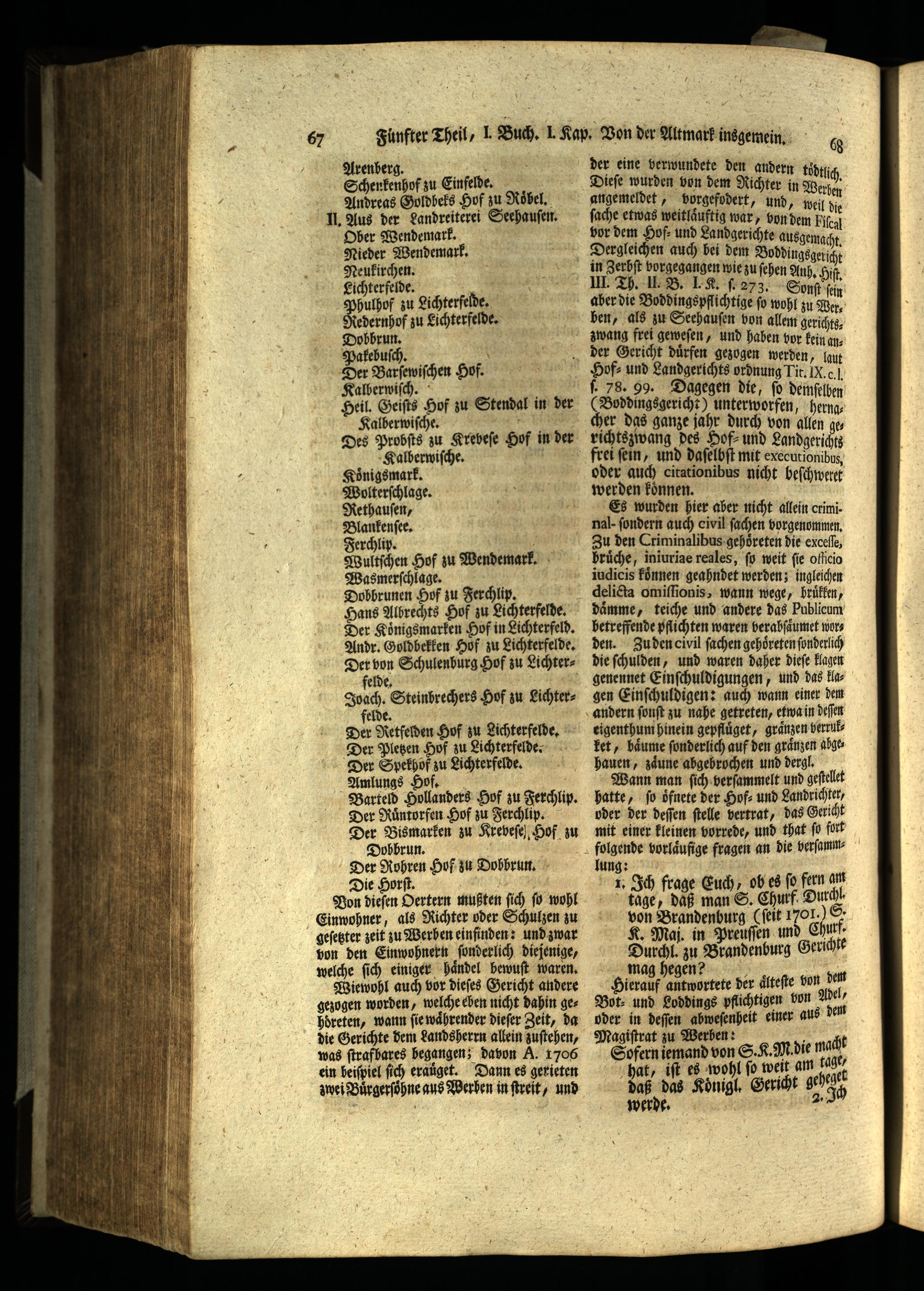 oder auch citationibus nicht beſchweret werden koͤnnen.| Es wurden hier aber nicht allein crimi. nal ſondern auch civil ſachen vorgenommen. Zu den Criminalibus gehoͤreten die exceſſe, bruͤche, iniuriae reales, fo weit fie offcio indicis koͤnnen geahndet werden; ingleichen delicta omiſſionis, wann wege, hruͤlken, daͤmme, teiche und andere das Publicum betreffende pflichten waren berabſaͤumet worden. Zu den civil ſachen gehoͤreten ſonderlich die ſchulden, und waren daher dieſe klagen genennet Einſchuldigungen, und das klagen Einſchuldigen: auch wann einer dem andern ſonſt zu nahe getreten, etwa in deſſen eigenthum hinein gepflůget, graͤnzen herrulket, baͤume ſonderlich auf den graͤnzen abgehauen, zaͤune abgebrochen und dergl. Wann man ſich ver ſammelt und geſtelet hatte, ſo oͤfnete der Hof⸗ und Landrichter, vder der deſſen ſtelle vertrat, das Gericht mit einer kleinen vorrede, und that ſo fort folgende vorlaͤufige fragen an die berſammn gh frage E ch b es fo fern am tage, daß man S. Churf Durch von Brandenburg(ſeit 1701.) 5 K. Maj. in Prenuſſen und Chur,